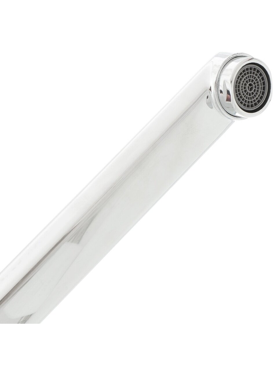 - Параметры: длинный поворотный излив 35 см, цинковый сплав, глянцевая хромированная поверхность