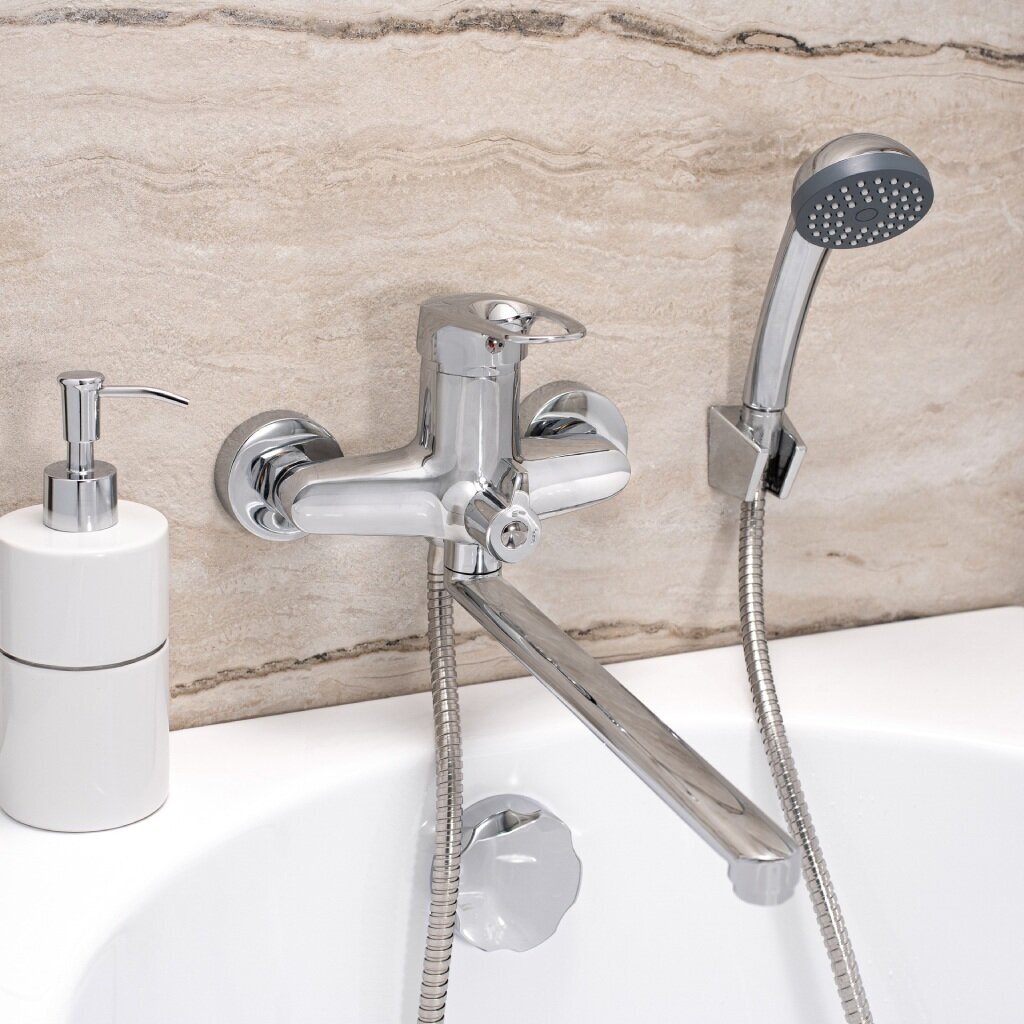 Многие спрашивают, как выбрать смеситель для ванны с душем, который не подведет при интенсивной эксплуатации. В SL55-006E установлен керамический картридж — он обеспечивает плавное переключение потоков воды без протечек. В отличие от аналогов с коротким изливом, эта модель идеально подойдет для стандартных и просторных ванн, а благодаря наличию лейки и аэратора расход воды остается экономичным. Если вы ищете, какой смеситель лучше для дачи или квартиры, обратите внимание на простоту монтажа: вертикальное настенное крепление и стандартная подводка 1/2" позволяют быстро установить устройство без вызова мастера.
