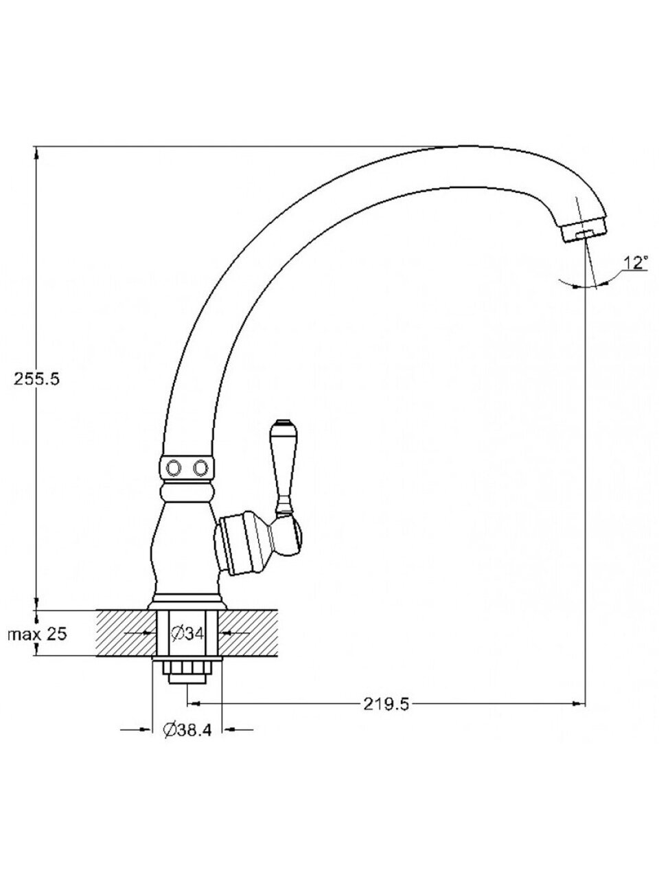Высокий поворотный излив, длина 22 см, форма круглая, средний размер — удобно для мытья посуды и наполнения емкостей.