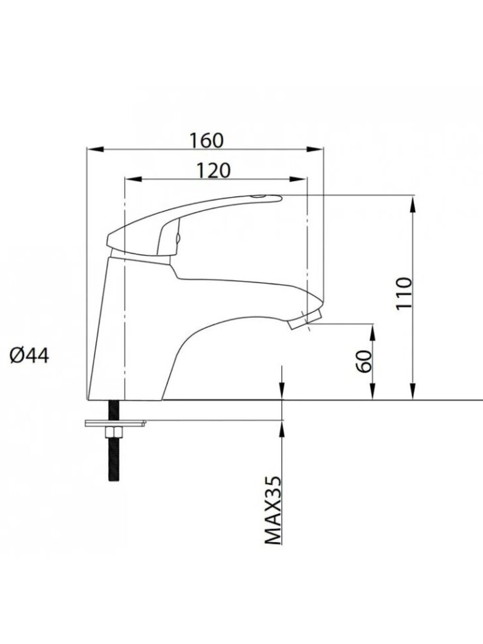 Для установки потребуется одно отверстие диаметром 35 мм. Крепление осуществляется на шпильку, стандарт подводки шланга — 1/2".