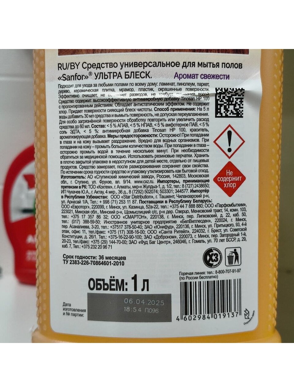 Средство для мытья полов Sanfor - универсальное моющее средство для домашнего использования, которое подходит для мытья любых поверхностей, от керамической плитки до деревянного паркета. Его концентрированная формула позволяет легко и эффективно удалять самые стойкие загрязнения, не оставляя разводов или запаха. Не требует смывания водой.
