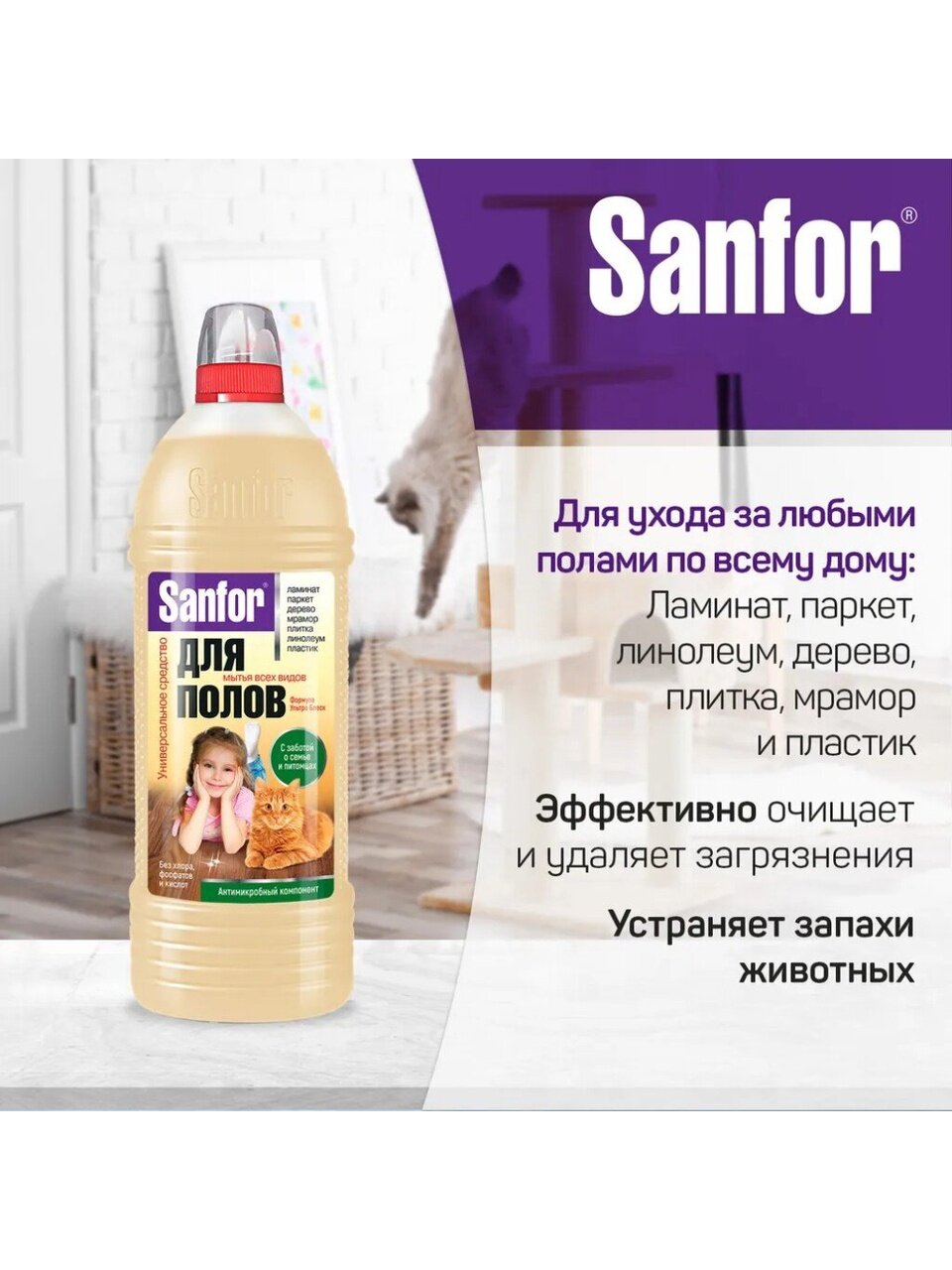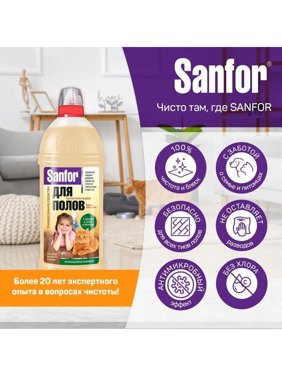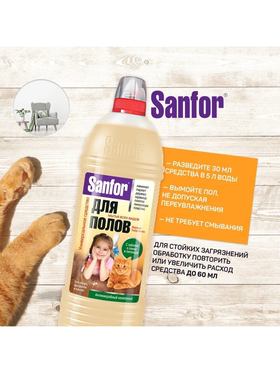 Средство Sanfor - Ваш универсальный помощник. Благодаря экологичному составу Вы можете проводить с ним уборку любых напольных покрытий во всех комнатах и даже в детской. Экономичный расход средства позволит Вам использовать одну упаковку несколько месяцев.