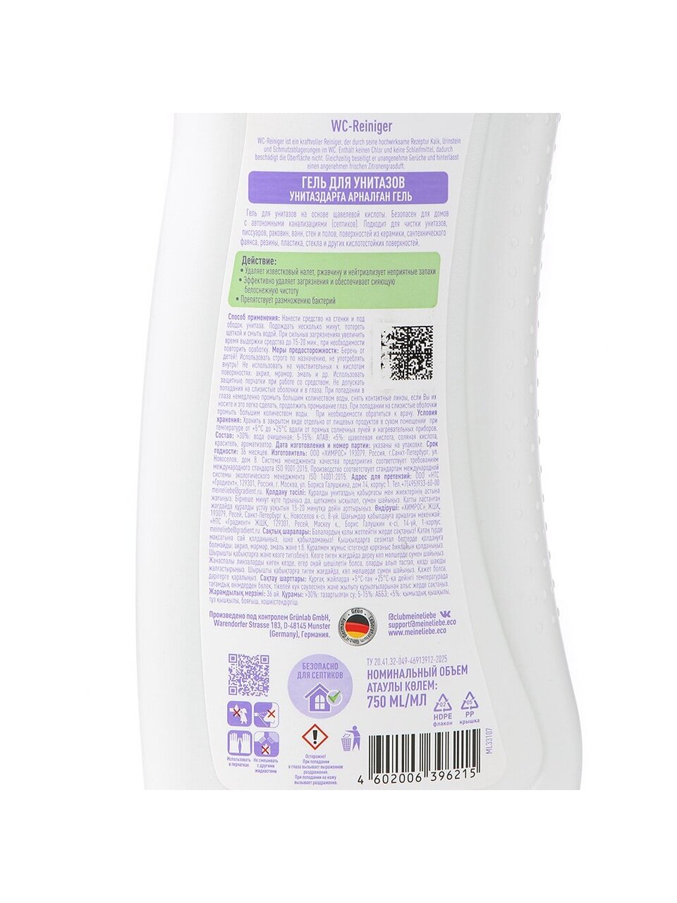Чистящее средство Meine Liebe, гель 750 мл для унитазов – эффективное решение для поддержания чистоты и свежести в доме. Удобная форма геля обеспечивает легкое нанесение и быстрое удаление загрязнений.