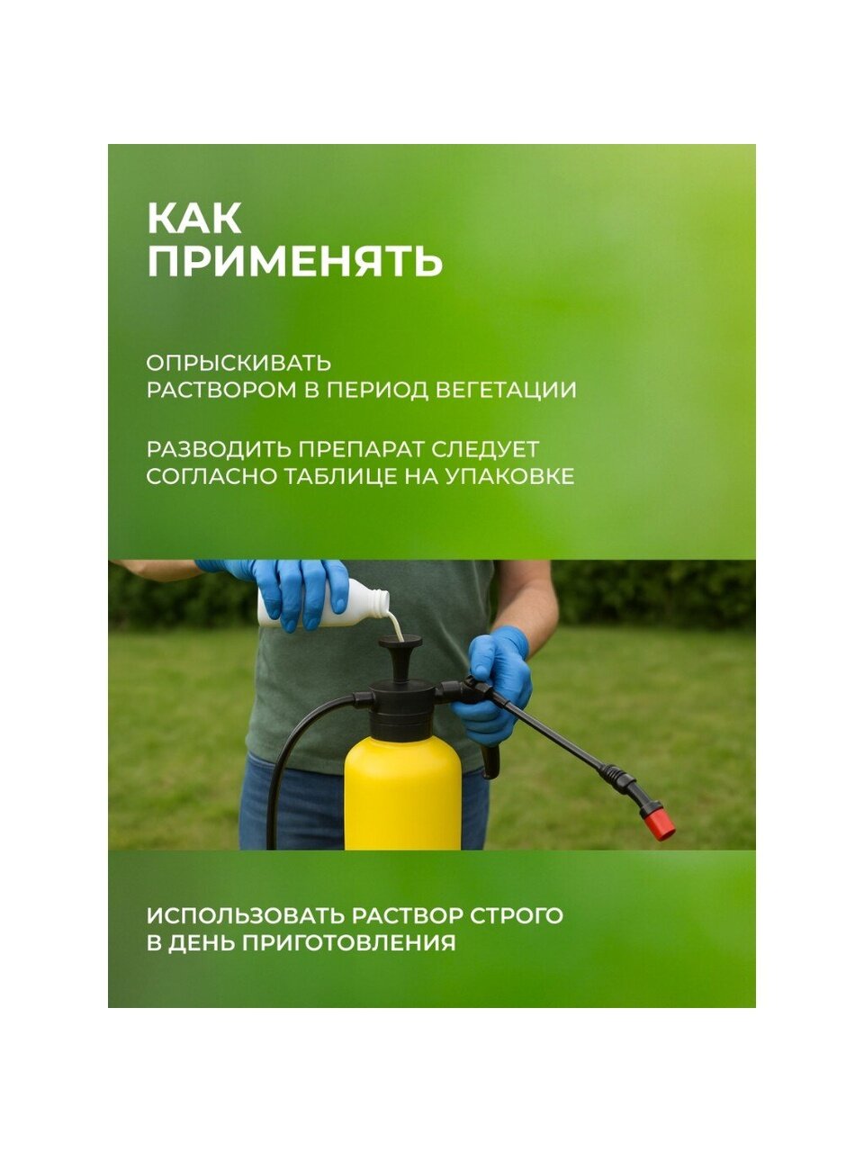Опрыскивание рабочей жидкостью в период вегетации. Для приготовления рабочего раствора в резервуар налить 1 литр воды, добавить необходимое количество препарата и тщательно перемешать. Далее долить воду до необходимого объема и еще раз перемешать. Рабочая жидкость должна быть использована в день приготовления.