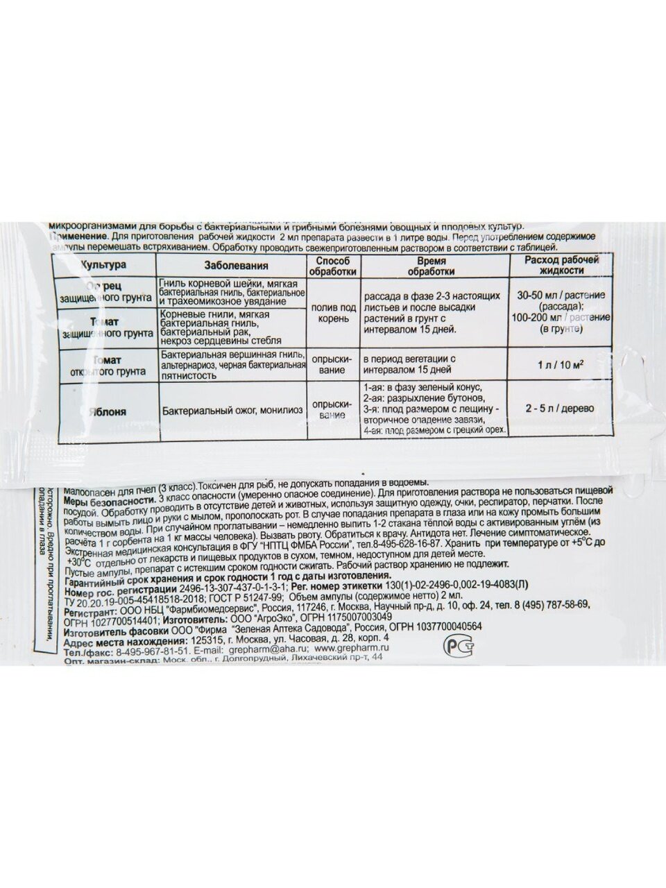 Препарат эффективен от корневых гнилей, сосудистых, листовых и др. бактериозов, черной ножки. Обладает местным действием (лечит пораженные листья) и системным действием (проникает в клеточные ткани растения и защищает новые побеги). Оказывает стимулирующее действие на развитие растений. Применяется в период вегетации путем опрыскивания, полива под корень, а также для замачивания семян.