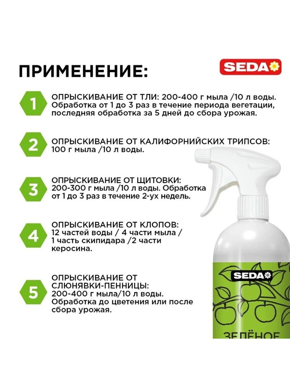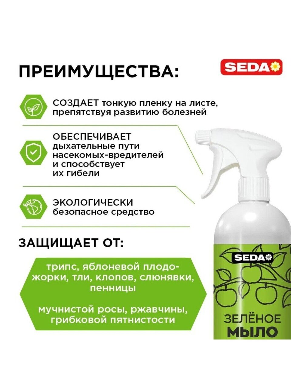 SEDA Зеленое мыло — это натуральный и безопасный продукт для ухода за растениями на основе солей жирных кислот и растительных масел. Экологически чистое средство защиты комнатных растений, овощных и плодово-ягодных культур от болезней (мучнистая роса, парша, ржавчина, фитофтора) и вредителей (тля, калифорнийский трипс, щитовка, клопы).