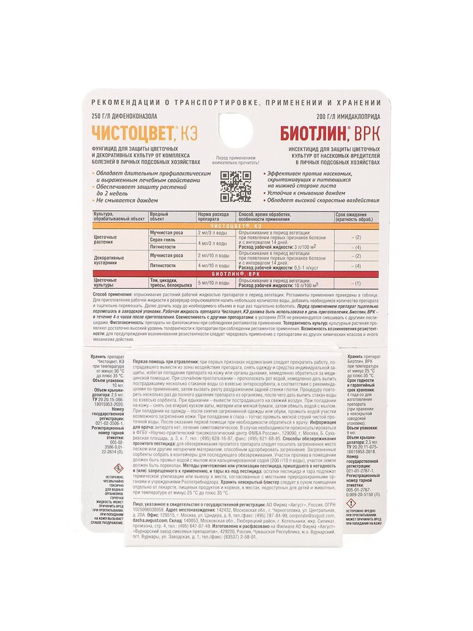 Чистоцвет+Биотлин предназначены для защиты цветов от мучнистой росы, пятнистостей и от трипсов, цикадок, тли.