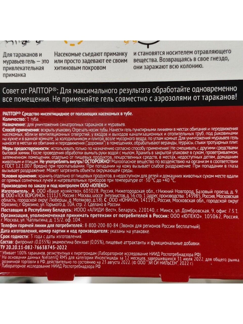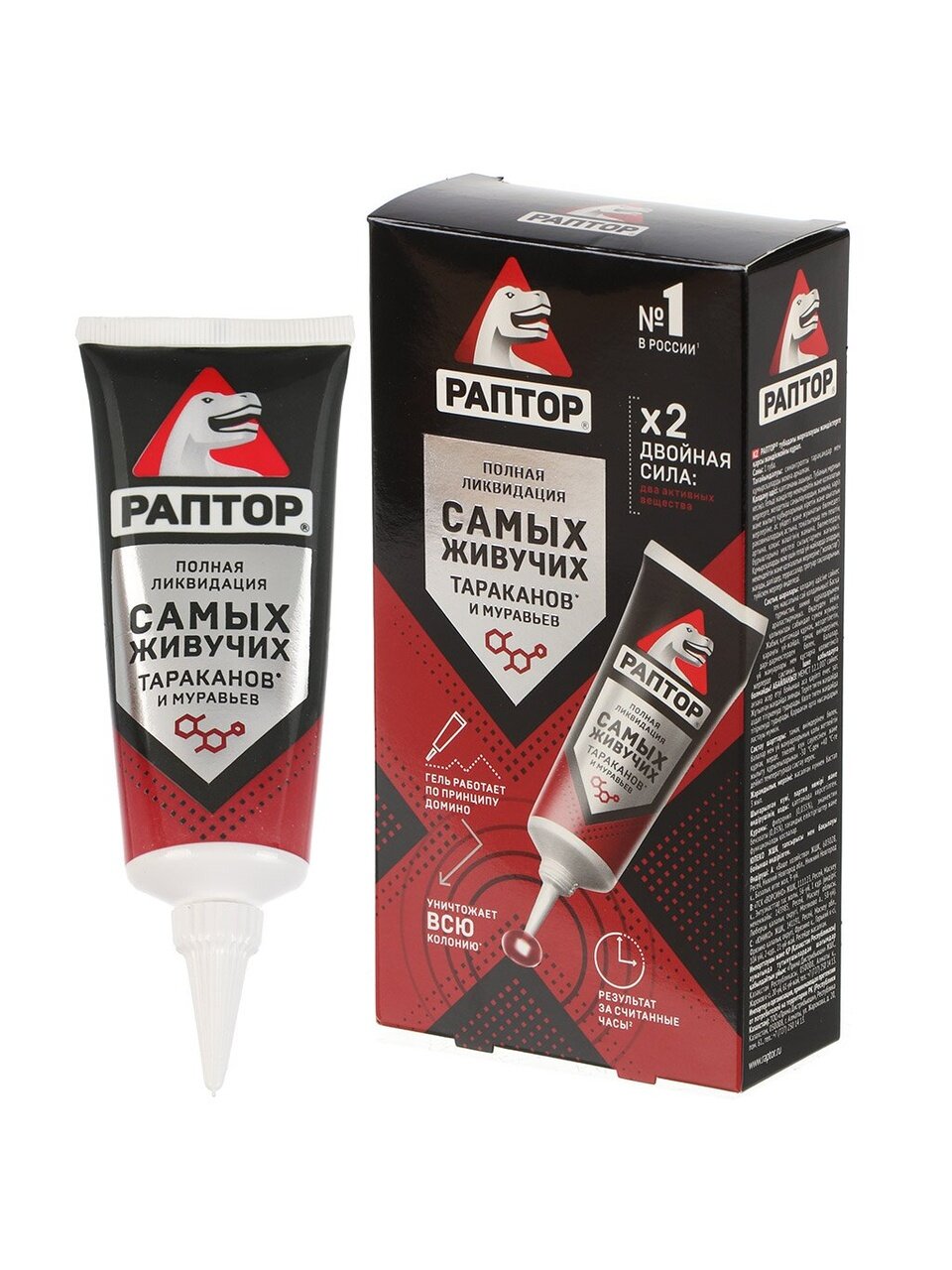 Гель от тараканов и муравьев Раптор - это профессионально уничтожение тараканов и муравьев. Эффект действия геля основан на том, что насекомое, съедая гель или контактируя с ним, становится носителем отравляющего вещества. Активное вещество действует постепенно. Таким образом, насекомое успевает вернуться в популяцию, где погибает само и заражает еще нескольких своих собратьев. Уникальная консистенция приманки позволяет ей дольше удерживать влагу и, соответственно, дольше оставаться привлекательной для насекомых. Для более активного привлечения насекомых используется натуральный экстракт абрикоса.