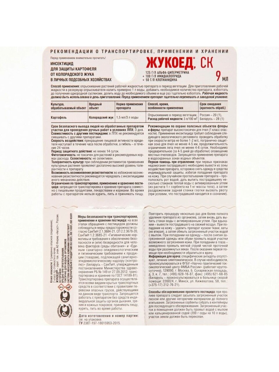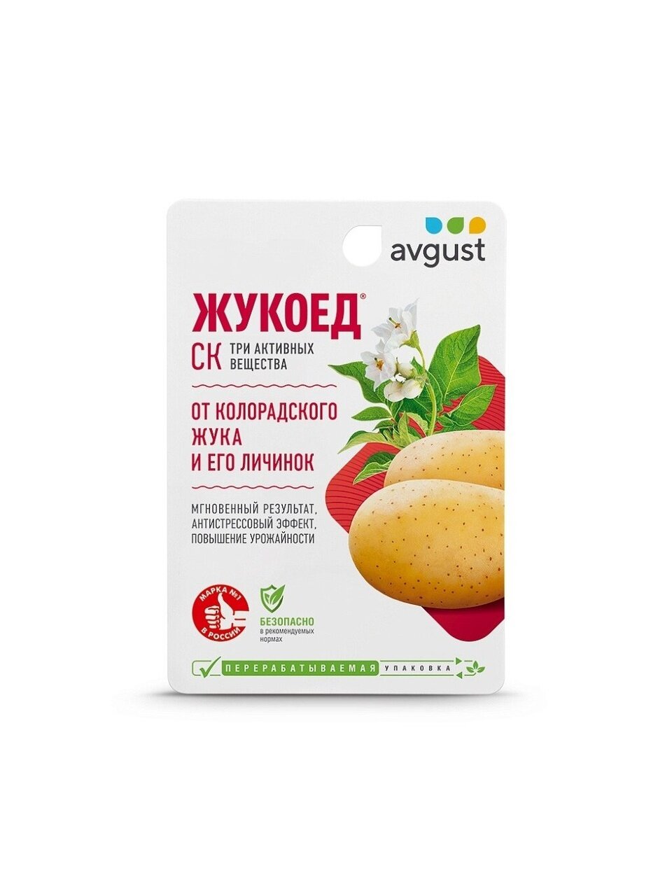 Жукоед обладает высокой скоростью действия и уничтожает даже скрытоживущих вредителей и питающихся на нижней стороне листа. Одна обработка препаратом Жукоед обеспечивает защиту картофеля на весь сезон. Действие препарата Жукоед не зависит от температуры и влажности воздуха. Жукоед — это не просто отрава от колорадского жука, ведь его применение повышает устойчивость картофеля к неблагоприятным воздействиям окружающей среды. Усиливает процесс фотосинтеза, способствуя увеличению вегетативной массы, тем самым улучшая качество картофеля.