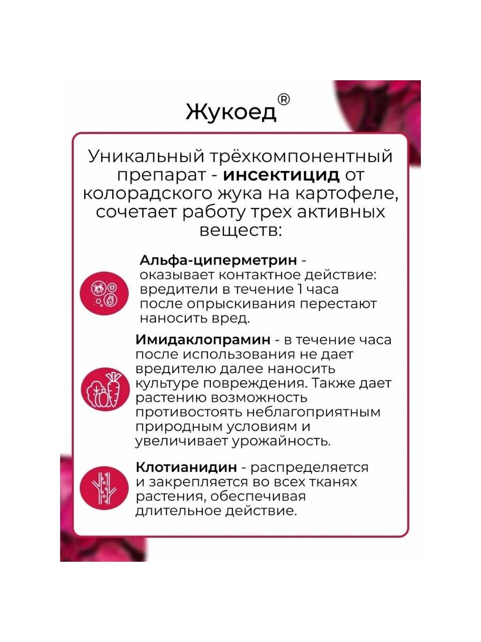 Новое решение в борьбе с колорадским жуком! Жукоед — инновационный препарат от колорадского жука на картофеле, в состав которого входят три активных действующих вещества, принадлежащие к разным классам химических соединений, отличающихся по механизму действия и физическим свойствам: