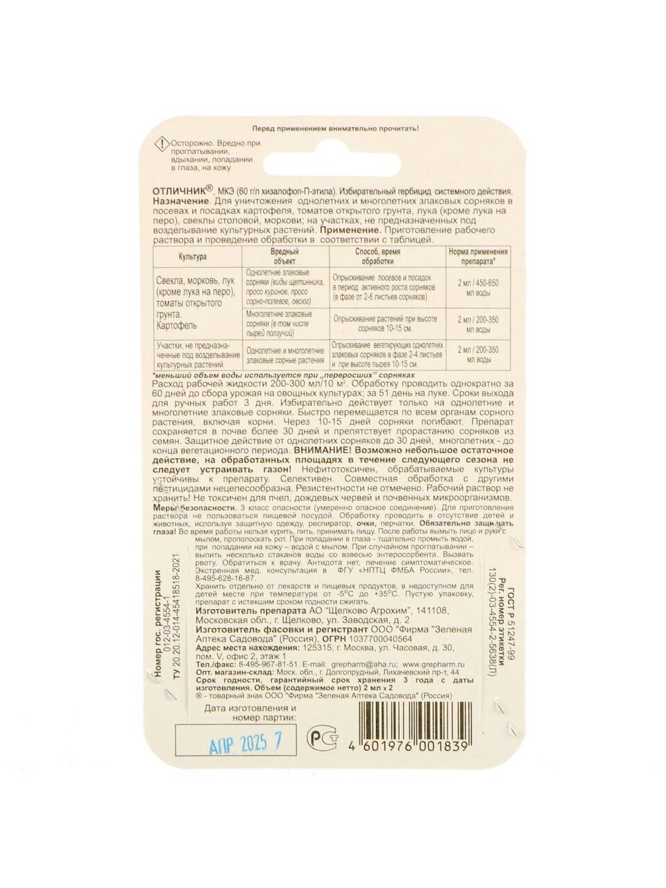Выбирая гербицид "Отличник", вы получаете надежную защиту своих культурных растений и избавляетесь от сорняков, что способствует более богатому урожаю и экономии времени на прополку. Оцените качество японского продукта и наслаждайтесь здоровыми растениями.