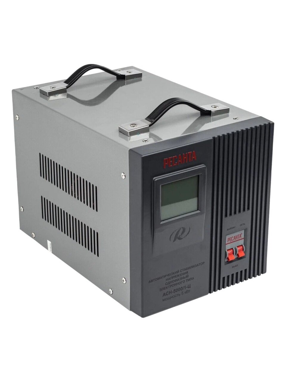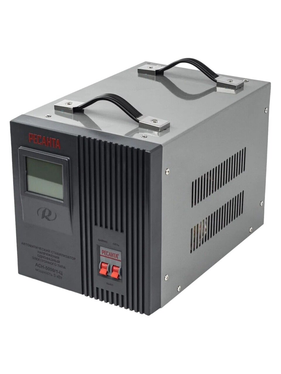 Стабилизатор напряжения однофазный Ресанта АСН 5000/1-Ц предназначен для выравнивания напряжения в сети. При превышении максимально допустимой мощности происходит автоматическое выключение. Чтобы возобновить работу стабилизатора, необходимо включить подачу питания.