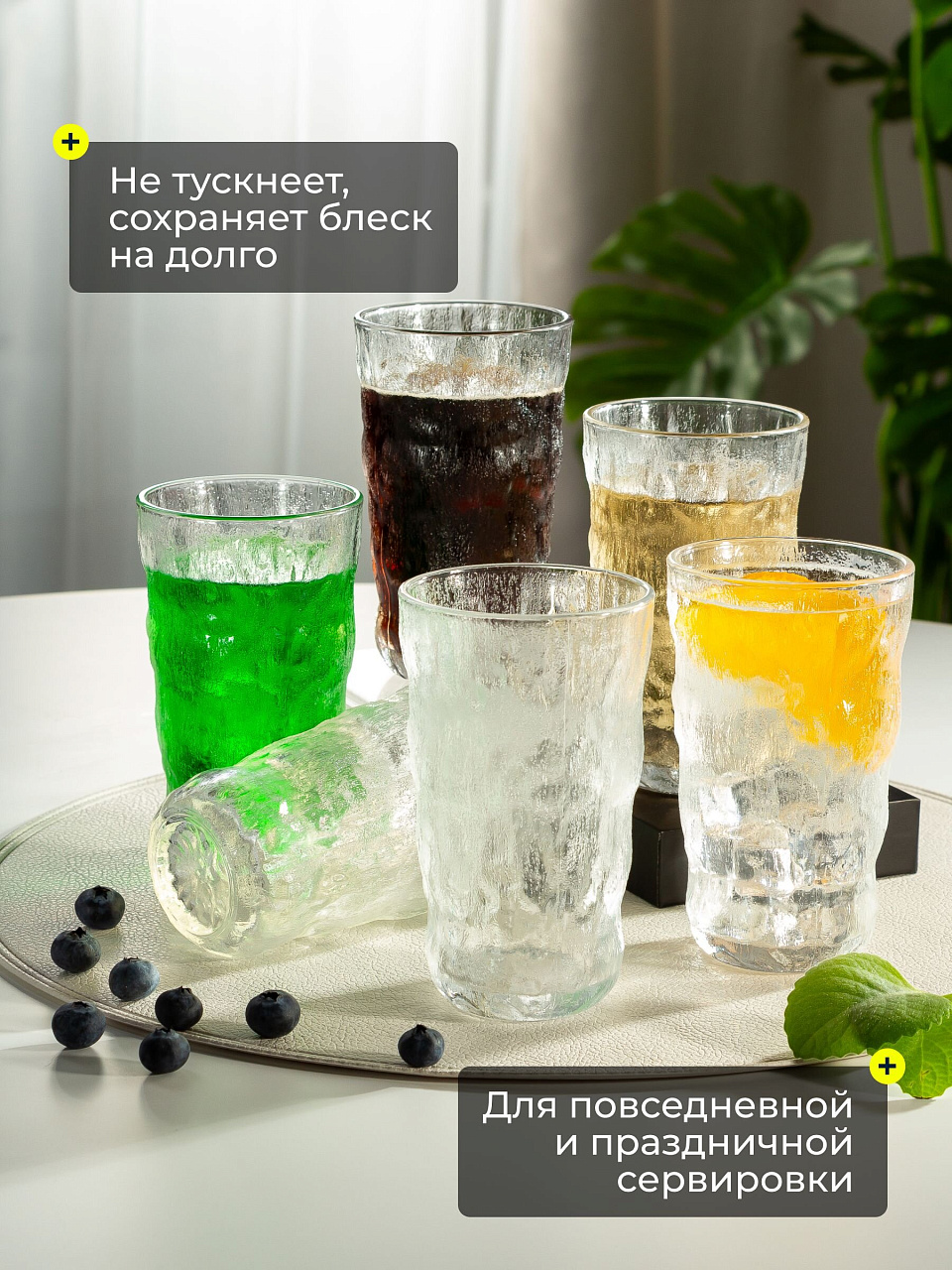 - Оптимальный объём 350 мл, прочное стекло, набор из 6 стаканов — удобно для семьи или гостей