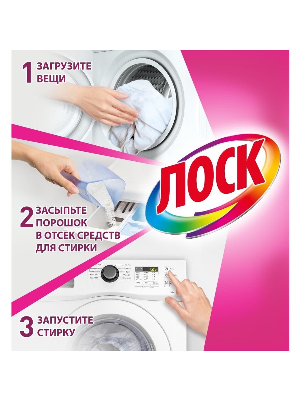 Насыпьте необходимое количество порошка в соответствующее отделение стиральной машины перед началом стирки. Подробная информация о дозировке указана на упаковке. Следуйте рекомендациям, указанным на ярлыках изделий. Изделия из тканей с неустойчивыми красителями стирайте отдельно. При ручной стирке перед загрузкой белья полностью растворите порошок в воде, после стирки несколько раз прополощите изделие в тёплой, а затем в холодной воде до исчезновения пены.