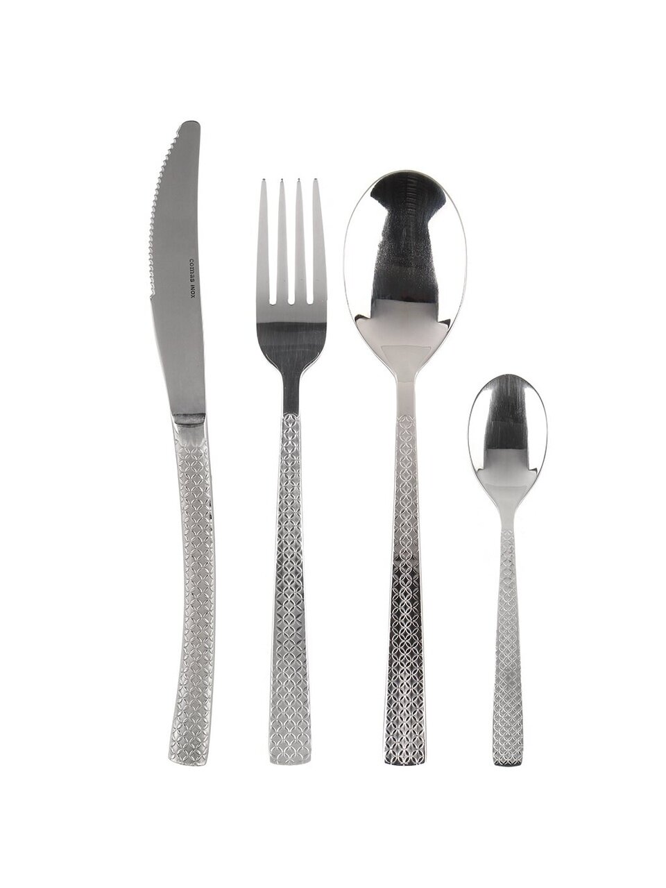 В наборе 24 предмета: ложки, вилки, ножи и чайные ложки, все из нержавеющей стали, без покрытия, в подарочной упаковке.