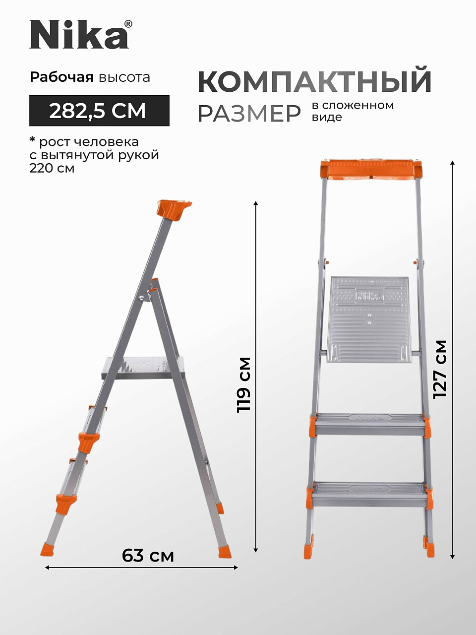 Стремянка Nika - это надежный и удобный инструмент для выполнения задач на высоте. Она имеет одну секцию и три ступени, что делает ее удобной в использовании в домашних условиях. Стремянка выполнена из прочной стали, что обеспечивает ее долговечность и надежность. Она выдерживает до 150 кг веса - это позволяет использовать ее для выполнения работ в доме, саду или на строительной площадке.