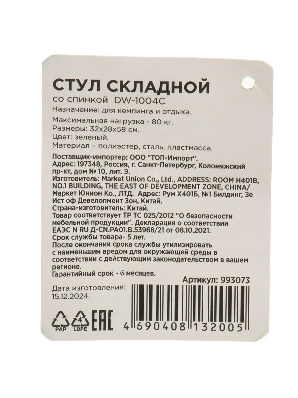 Вы можете приобрести «Стул складной, со спинкой, сталь, полиэстер, 80 кг, 32х28х58 см, зеленый, DW-1004C, 993073» и другие товары в нашем интернет-магазине в Обнинске по низким ценам и с бесплатным самовывозом.