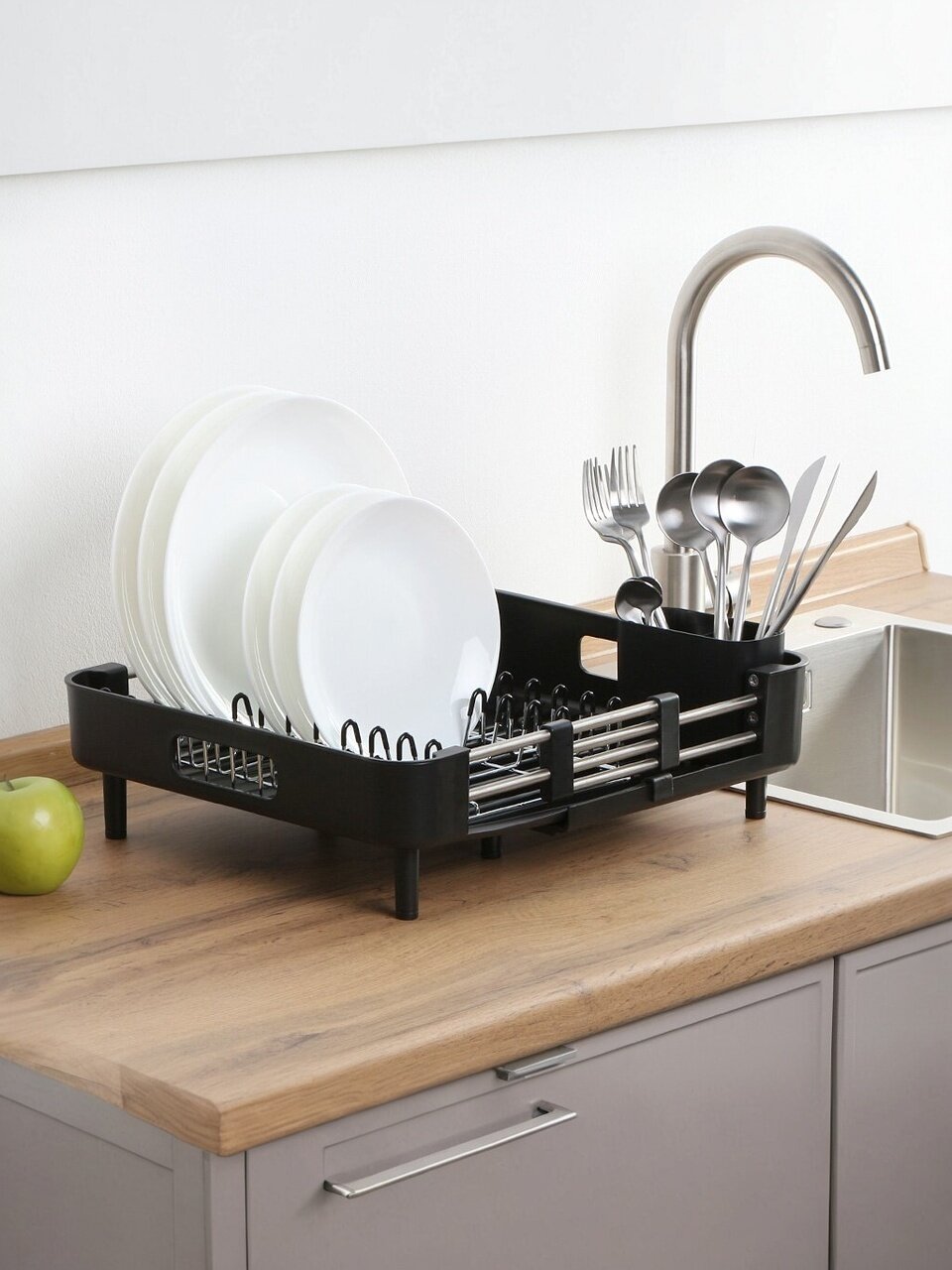 - Раздвижная система — легко подстраивается под объём посуды, экономит место на кухне