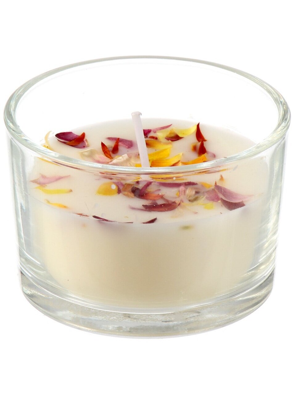 Декоративная свеча 5х7.5 см в стакане с лепестками цветов — стильный акцент для уюта и подарка: натуральный воск, хлопковый фитиль, выбор цвета.