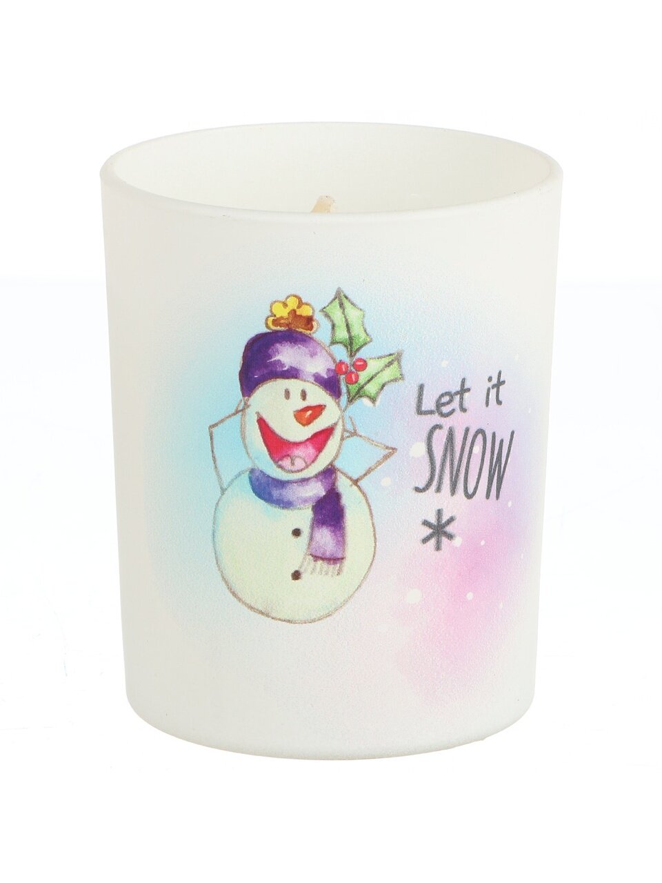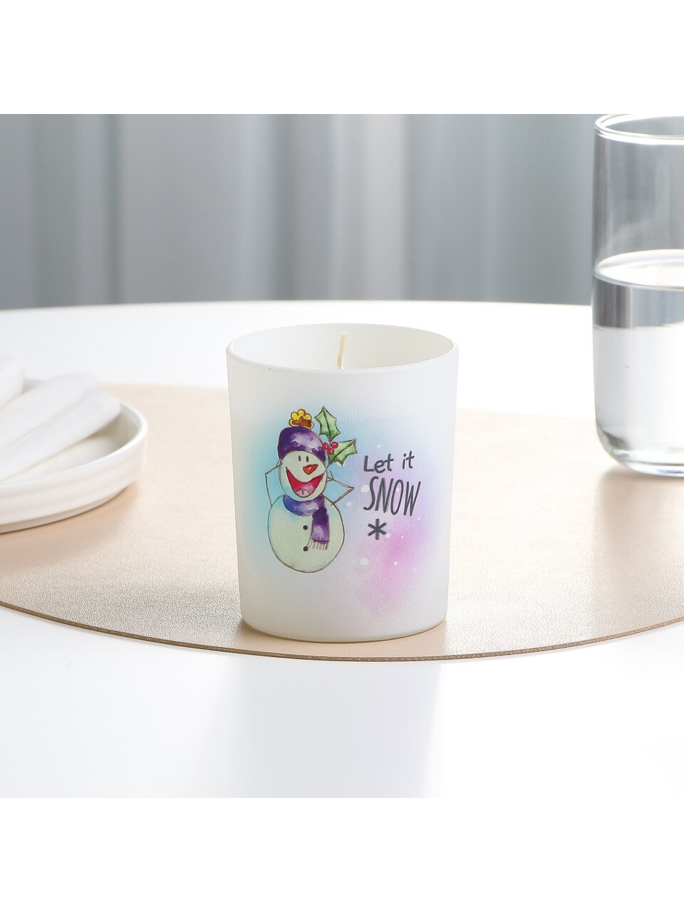 Свеча декоративная Let it snow 9.3х7.7 см — стильный акцент для зимнего уюта: безопасный парафин, стеклянный подсвечник, идеальный подарок на Новый год.