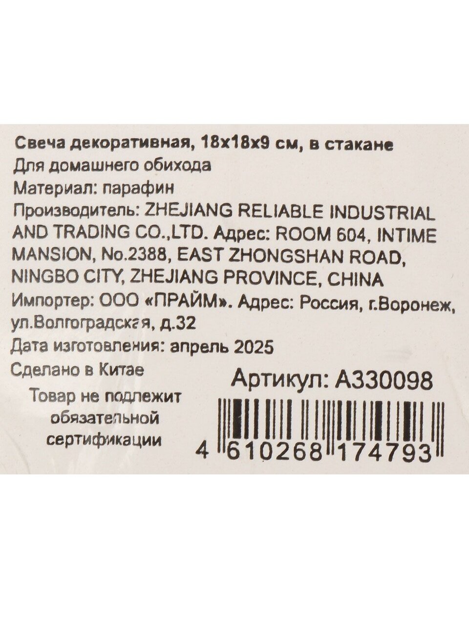 Декоративная свеча в стакане 9х18х18 см: стильный акцент для уюта, подарка и новогоднего декора — парафин, хлопковый фитиль, подарочная упаковка.