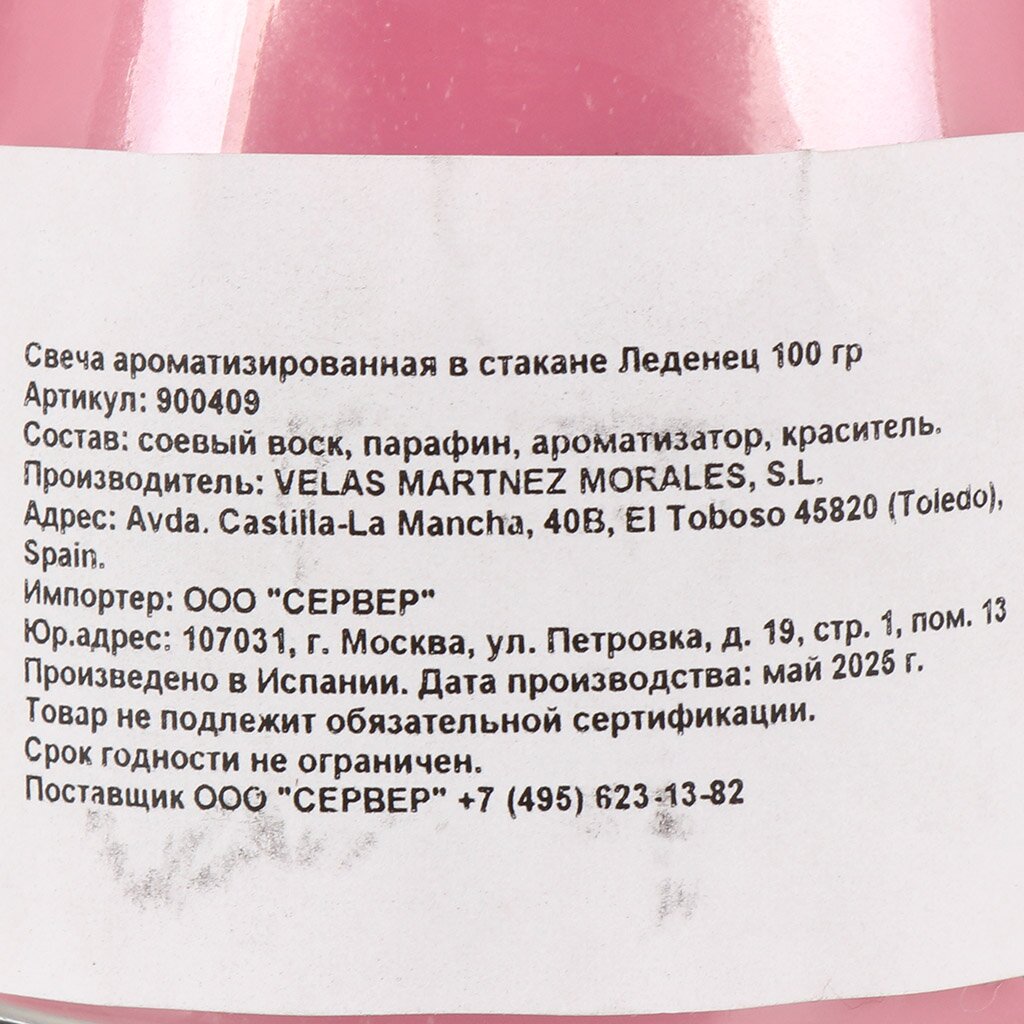 Свеча обладает насыщенным ароматом леденца, а её цвет — розовый. Это делает её оригинальным декором и отличным выбором для подарка.