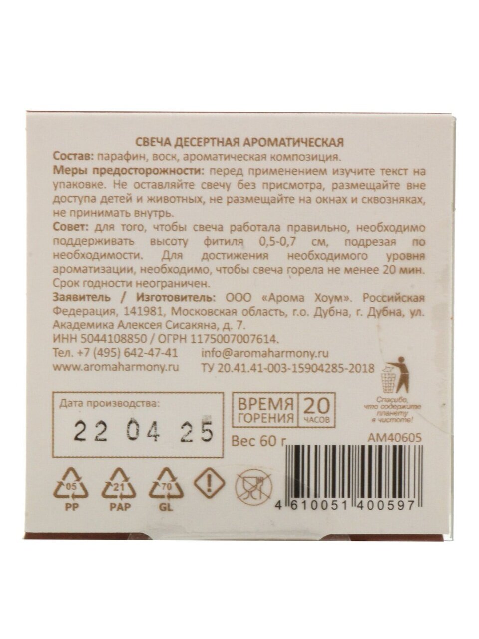 Свеча изготовлена из смеси пчелиного, соевого и парафинового воска с хлопковым фитилем. Натуральные компоненты обеспечивают чистое горение без вредных примесей, подходит для использования в жилых помещениях.