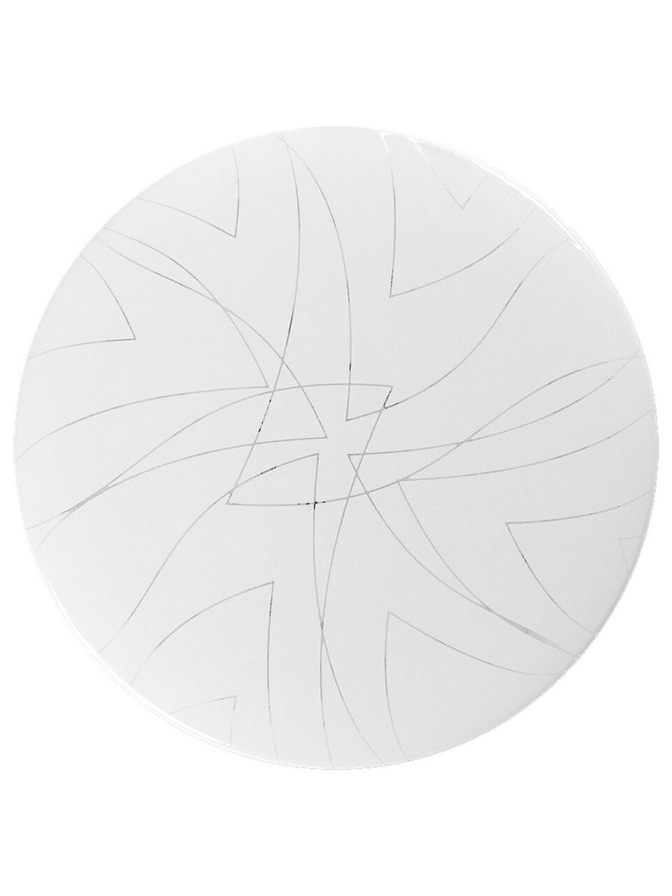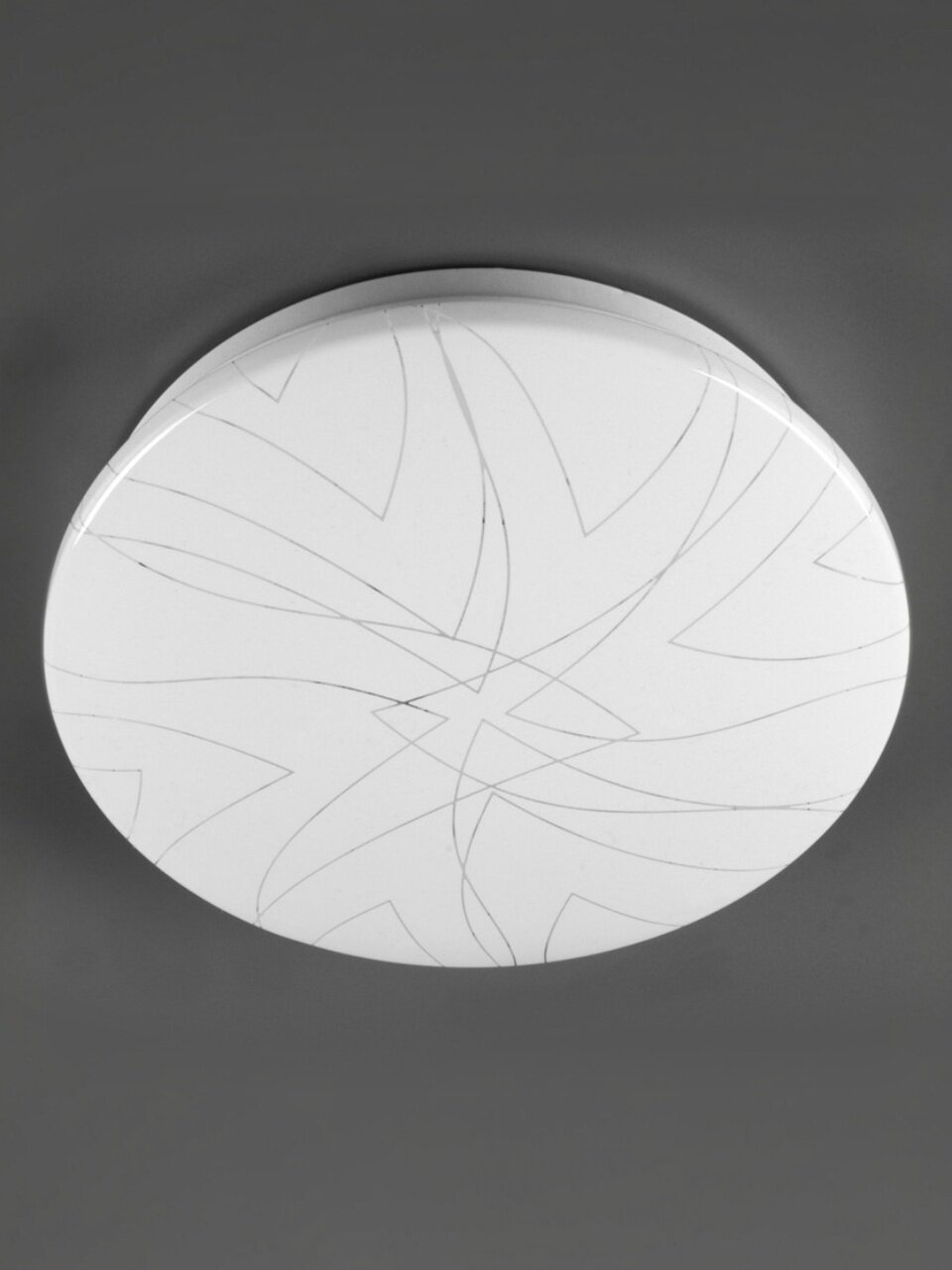 Светильник круглый, размеры: длина 25,3 см, ширина 23 см, высота 5,8 см. Корпус и плафон выполнены из пластика, монтаж — накладной.