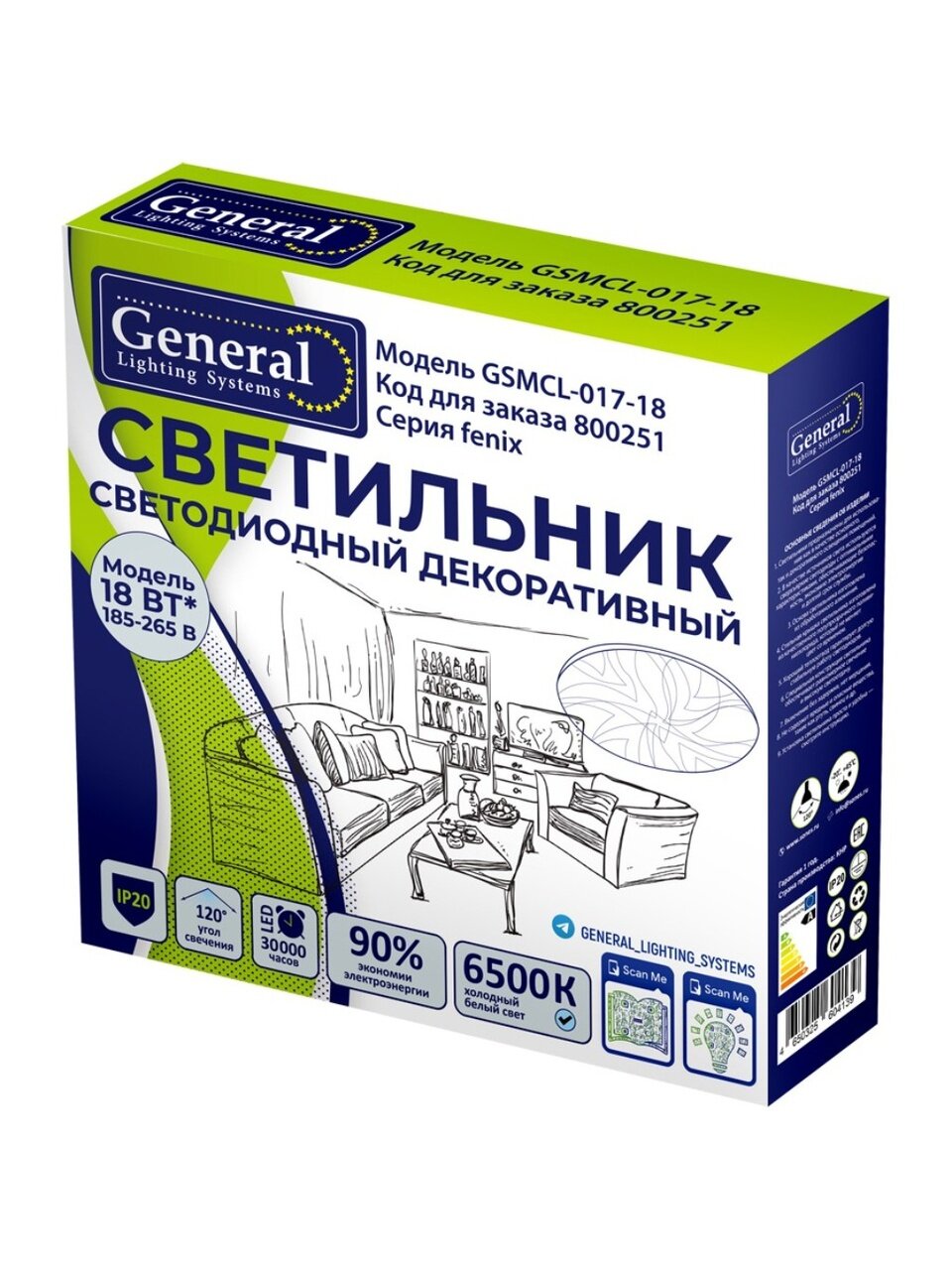 Светодиодный потолочный светильник General 18 Вт — яркое освещение 6500K для квартиры и офиса, энергоэффективность и срок службы до 30 000 часов по доступной цене.