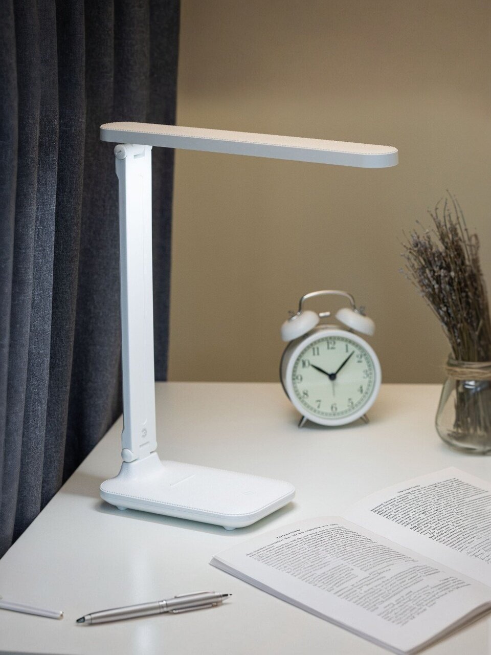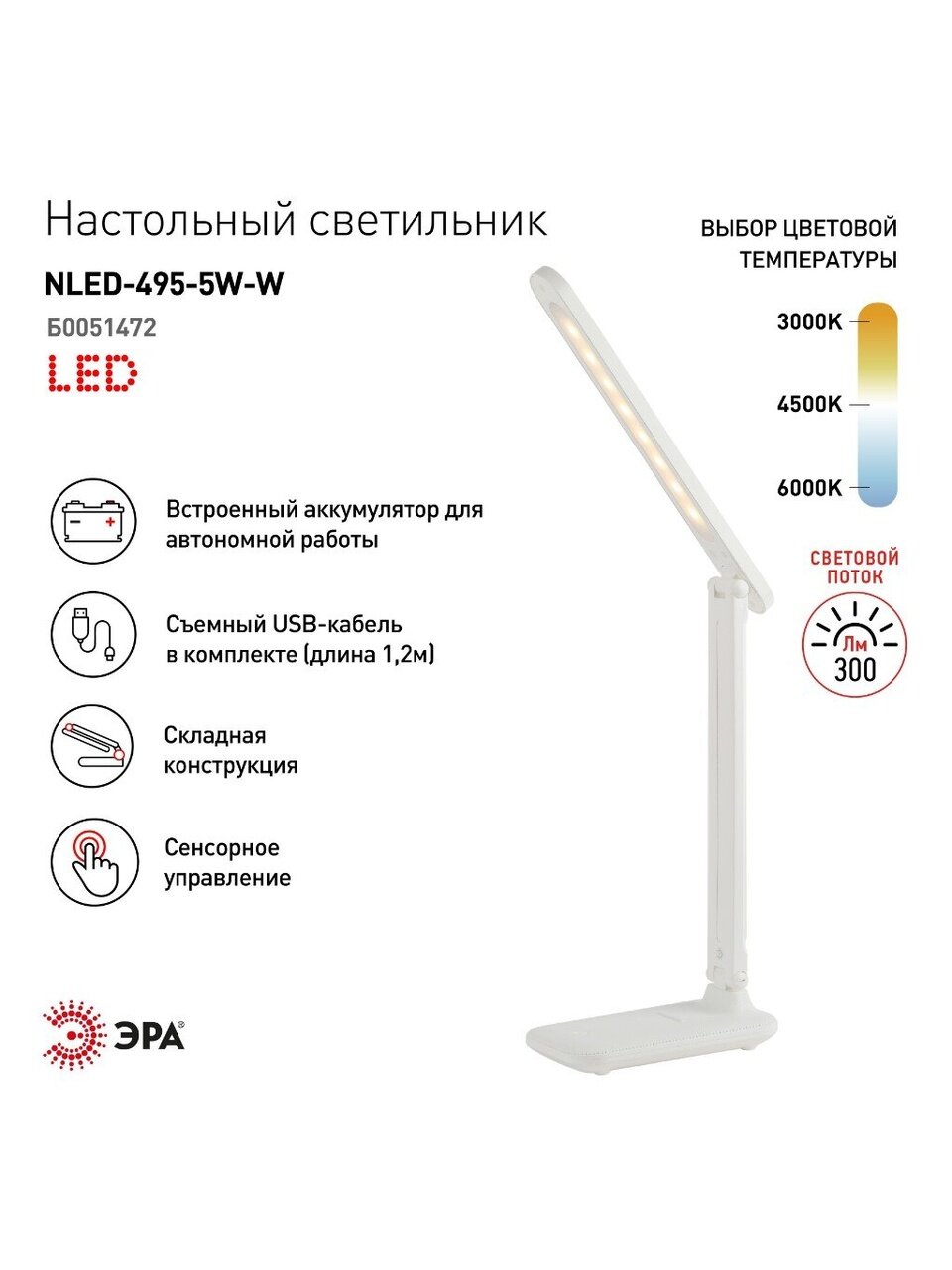 Настольный светильник ЭРА NLED-495-5W-W со светодиодами (LED) в качестве источников света в дизайне "под кожу". Встроенный литиевый аккумулятор для автономной работы. Подзарядка от USB. USB-кабель в комплекте. Оснащен сенсорным управлением с возможностью выбора цветовой температуры (теплый, нейтральный или холодный свет). Плавный диммер для регулировки яркости. Выключатель для отключения/блокировки сенсора. Направление света регулируется наклоном стойки и поворотом панели со светодиодами относительно стойки для максимального комфорта. Складная конструкция для оптимального хранения.
