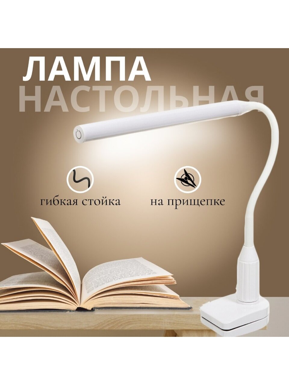 Настольный светильник с прищепкой - современная по стилю исполнения, экономичная в энергопотреблении, надежная, долговечная и безопасная в эксплуатации модель. Удобная подставка-прищепка поможет надёжно закрепить прибор на краю стола, в изголовье кровати или любом другом нужном месте. Благодаря гибкой ножке, лампу можно согнуть под любым углом и направить поток света в необходимую сторону. Запаса яркости будет вполне достаточно для чтения, письма, работы за компьютером.