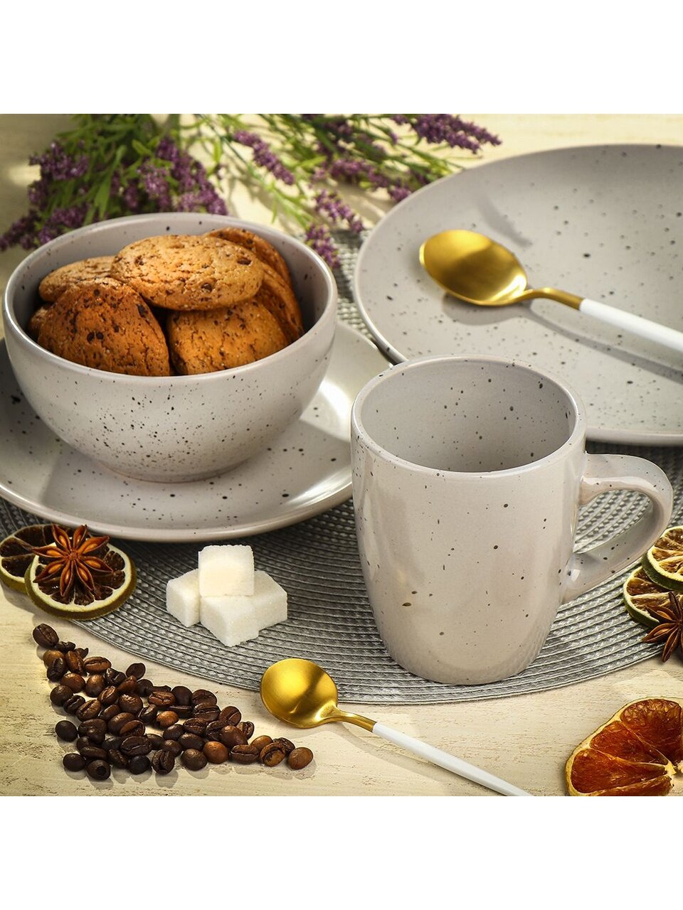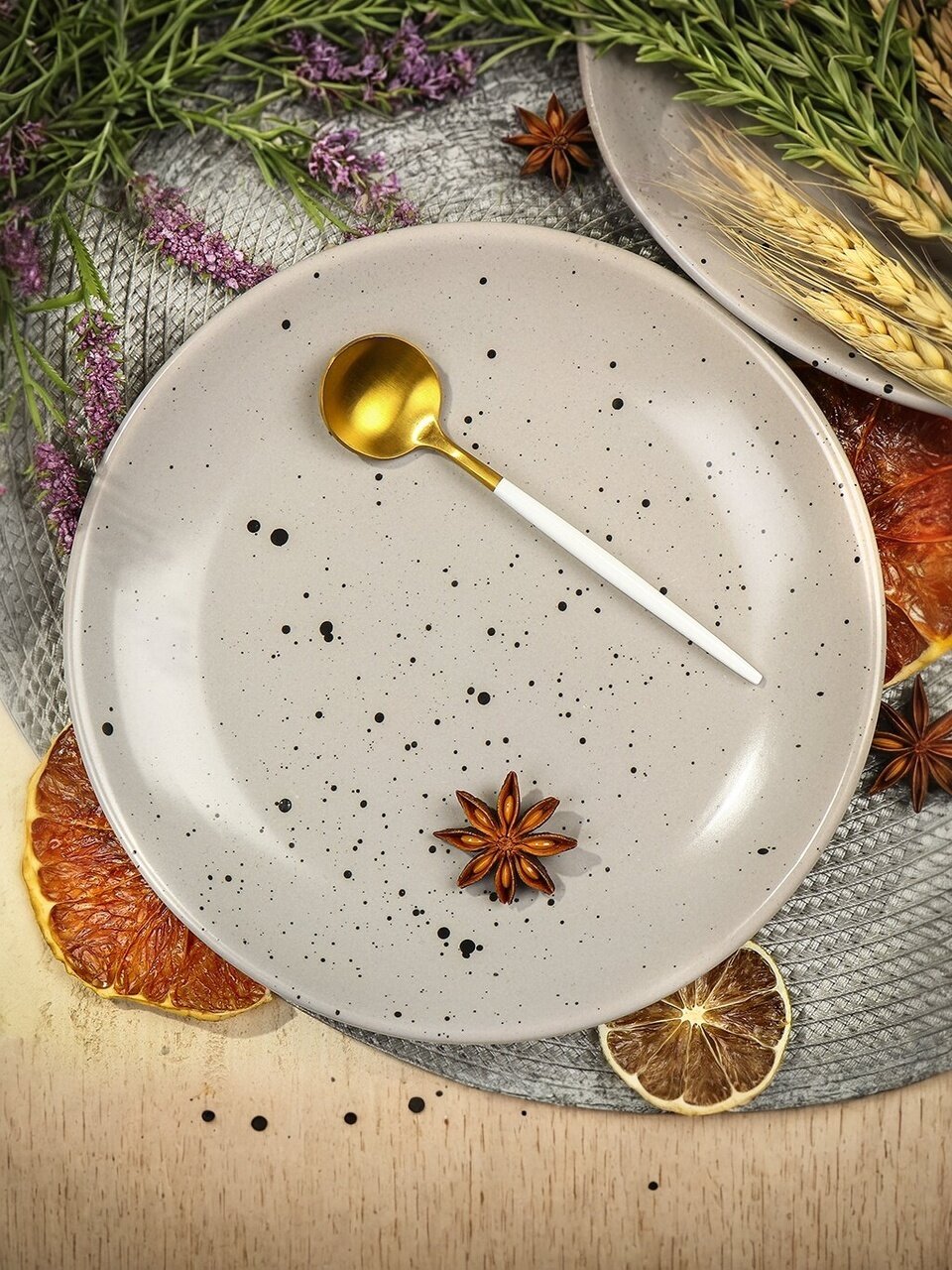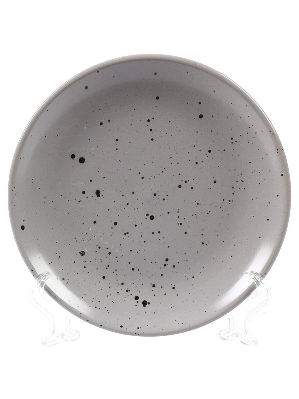 Диаметр тарелки — 19 см, материал — каменная керамика с декоративным рисунком в крапинку, форма — круглая, цвет — серый.