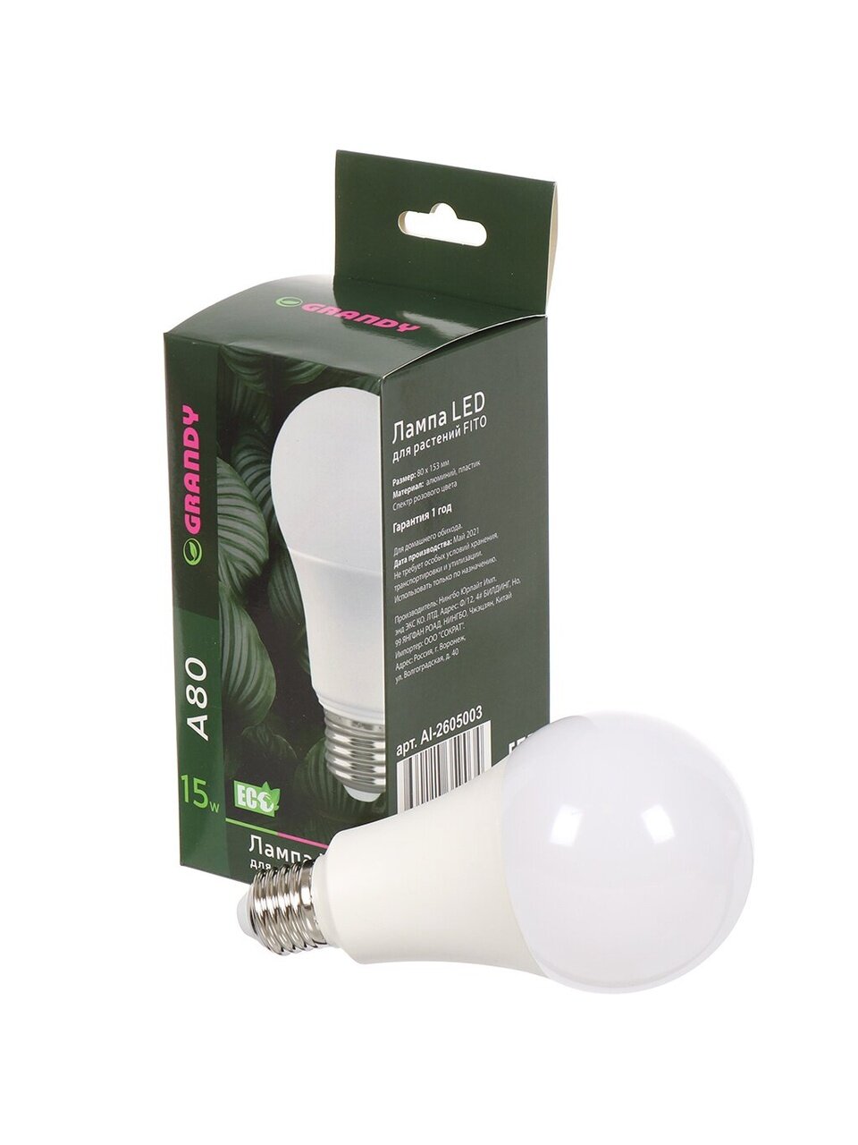 Вы можете приобрести «Лампочка светодиодная для растений, E27, 15 Вт, 220 В, IP40, A80, 80х153 мм, Grandy, FITO, AI-2605003» и другие товары в нашем интернет-магазине в Коврове по низким ценам и с бесплатным самовывозом.