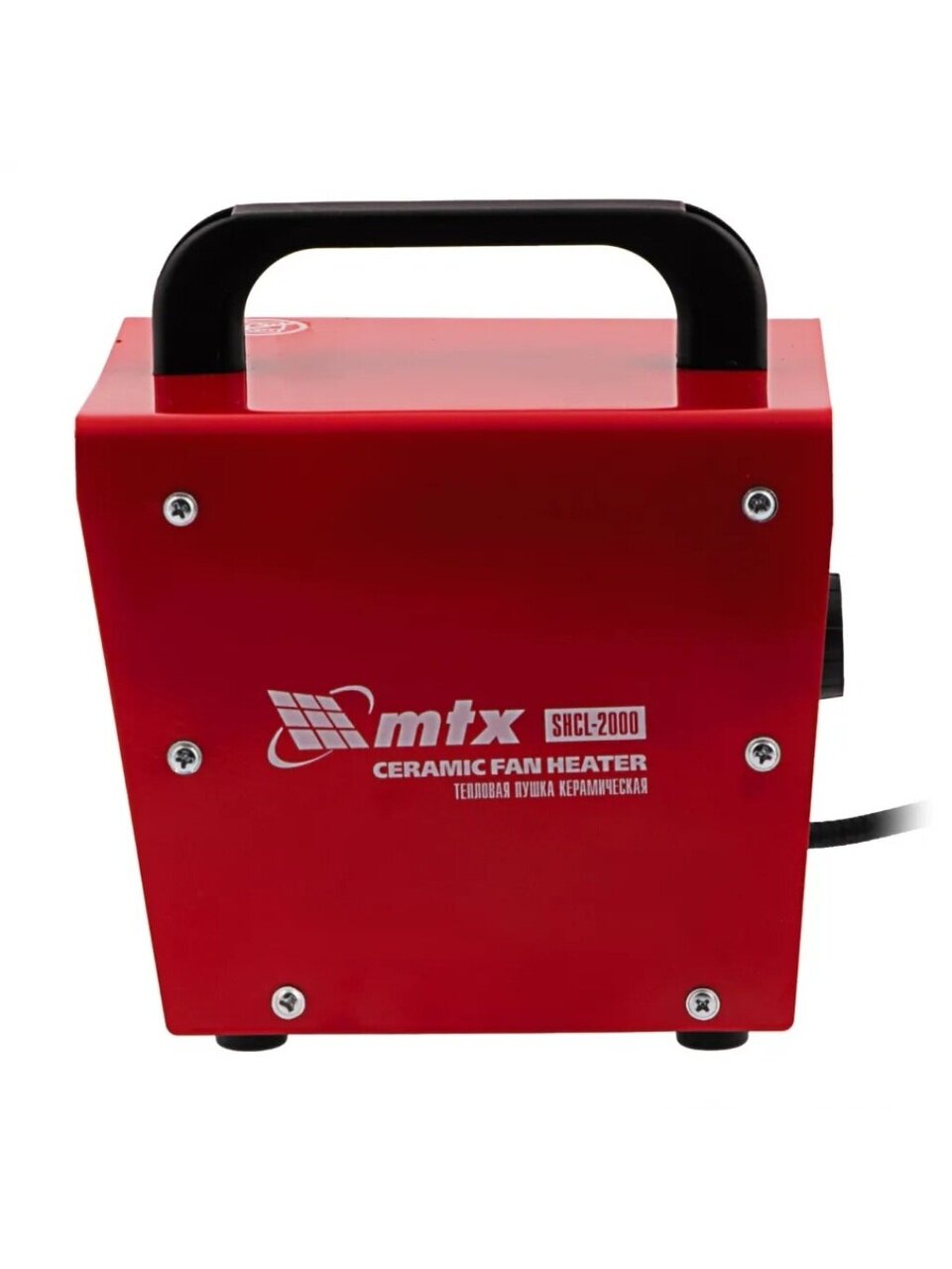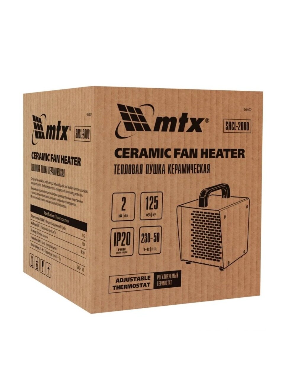 Керамическая тепловая пушка MTX SHCL-2000 производительностью 125 куб. м/ч, в квадратном корпусе, работает в режиме нагрева на полной мощности 2 кВт или частичной 1 кВт, а также в режиме вентиляции. Предназначена для обогрева цехов, складов, мастерских и других нежилых помещений площадью до 20 кв. м. Также позволяет быстро просушивать различные поверхности, например, стяжки пола или оштукатуренные стены.