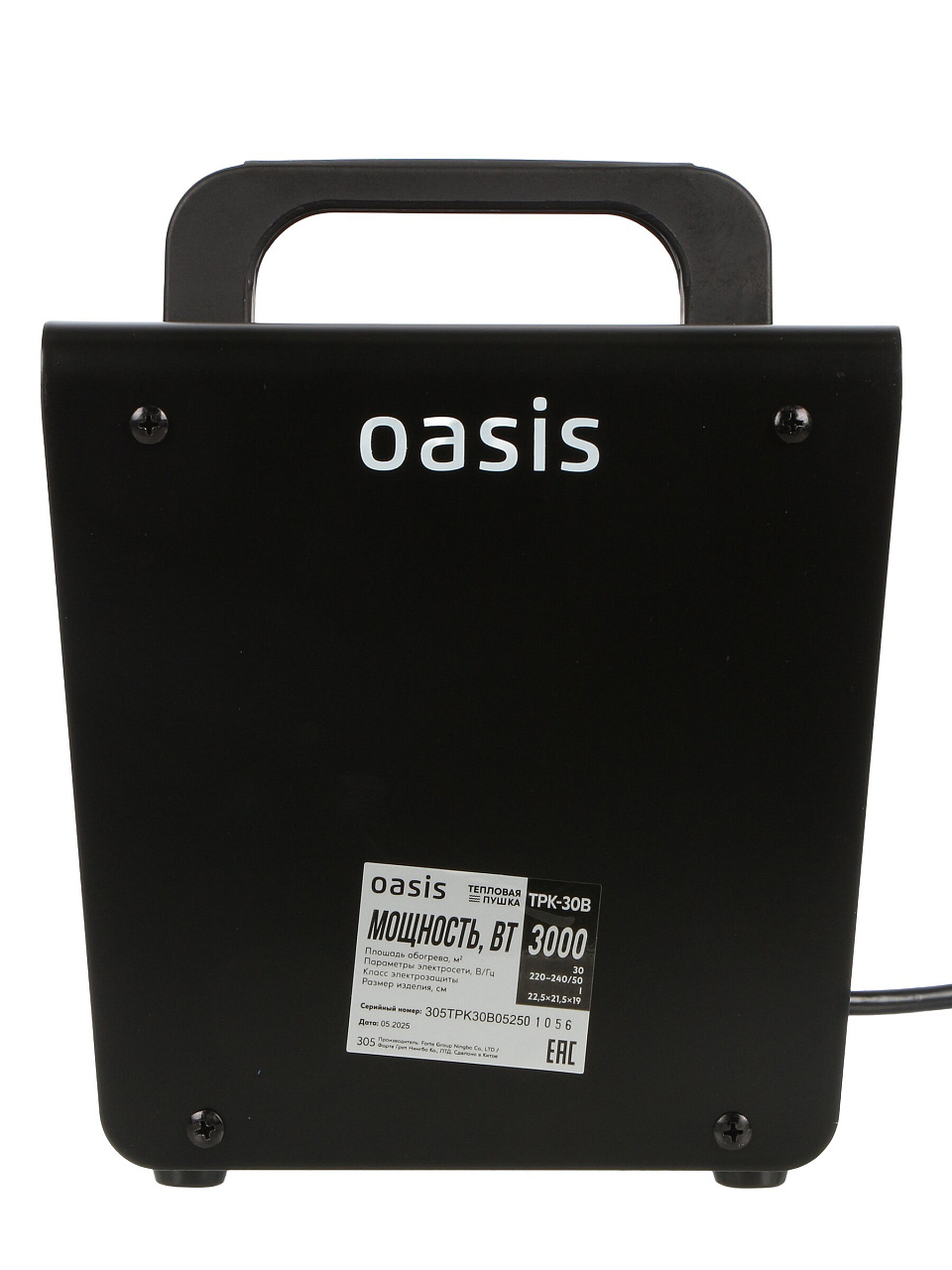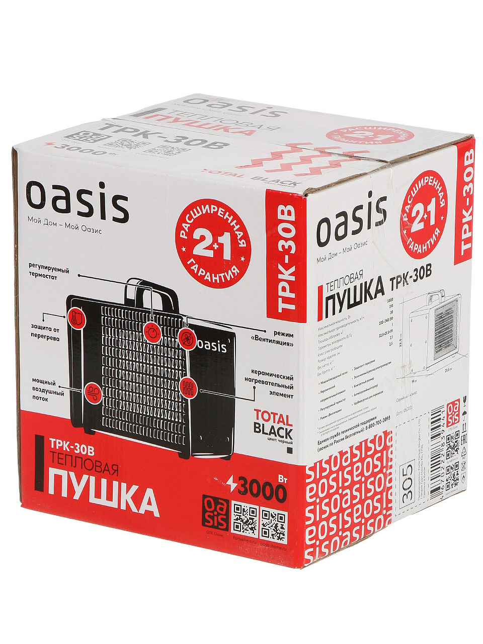 Электрическая тепловая пушка Oasis TPK-30В — быстрое и безопасное обогревание до 30 м², 2 режима мощности и керамический элемент для экономии энергии.