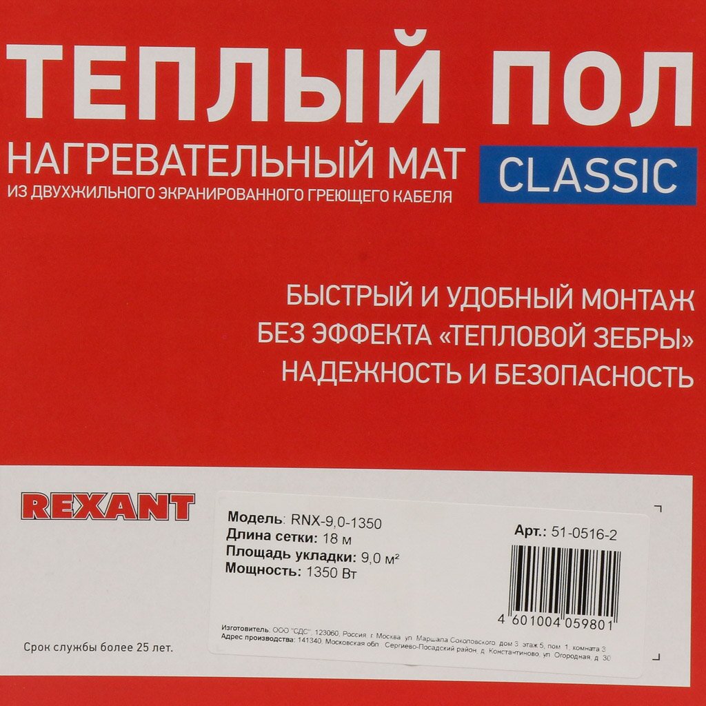Rexant Classic RNX-9-1350 рассчитан на обогрев до 90 м², оптимален для просторных помещений, легко монтируется под стяжку или плитку, степень защиты IP67 позволяет использовать в любых условиях.