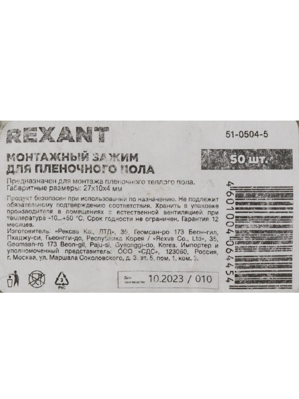 В наборе 50 монтажных зажимов Rexant, предназначенных для подключения любых видов пленочного теплого пола.