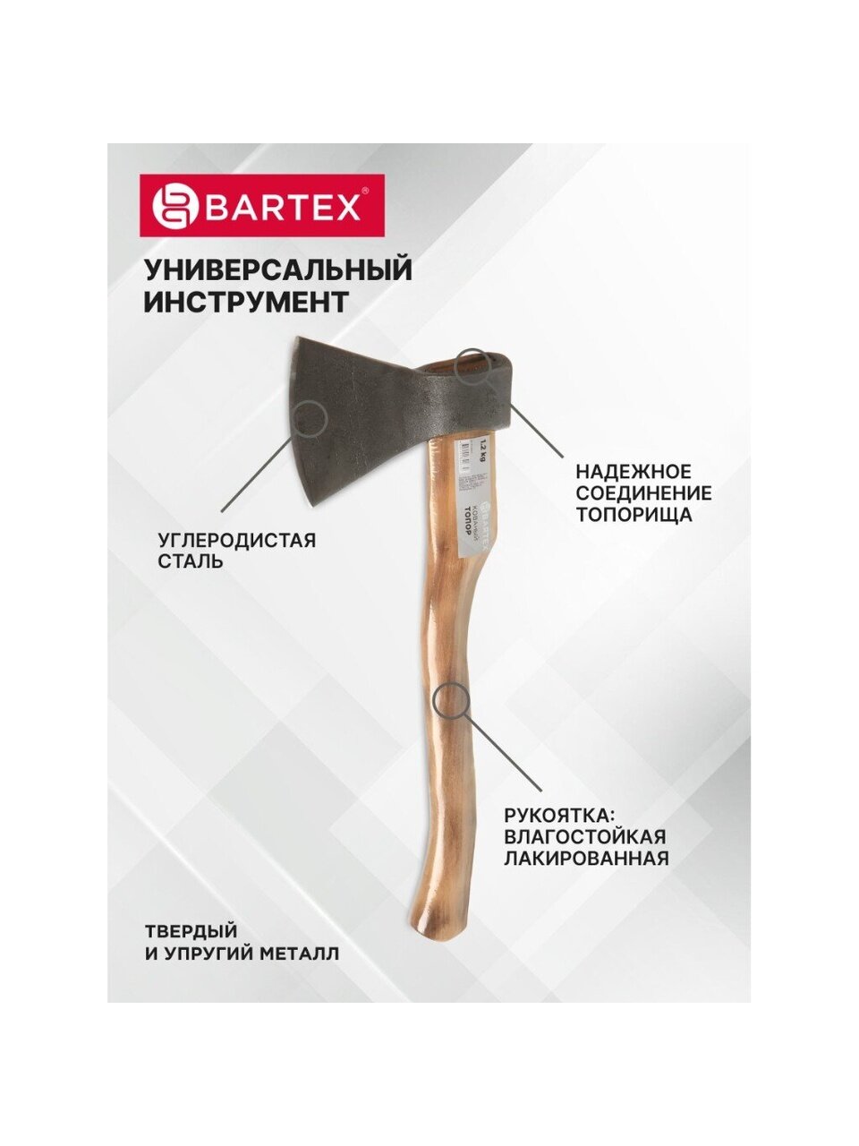 Топор является распространенным ручным плотницким инструментом. Рабочая часть топора Bartex изготовлена из конструкционной стали, что обеспечивает лезвию необходимую твердость и высокую износоустойчивость. Рукоятка инструмента сделана из древесины, известной своей высокой прочностью при ударных нагрузках. Топор широко используется при проведении столярных и строительных работ. Служит для раскалывания, строгания древесины, а также для придания ей определенной формы. Может быть использован для рубки деревьев и кустарников.