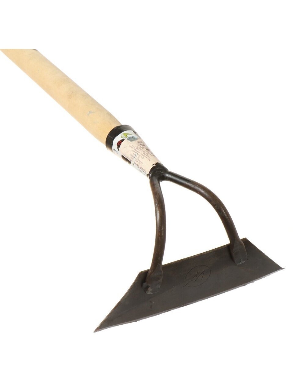 Металлическая тяпка изготовлена из высококачественной стали с термообработкой, имеет характерную особенность самозатачиваться в процессе работы. Режущая часть тяпки имеет твердый слой (закален на глубину 0,1 мм до твердости HRC 63 единицы) и мягкий слой, который стачивается во время работы, позволяя тяпке оставаться всегда острой. Ширина закалки 30 мм. Специальное клеймо, нанесённое на поверхность тяпки, подтверждает, что она является самозаточной. Твердость можно проверить напильником - он будет скользить. Подправить лезвие можно только абразивным бруском. Необходима для прополки, рыхления почвы, окучивания грядок.