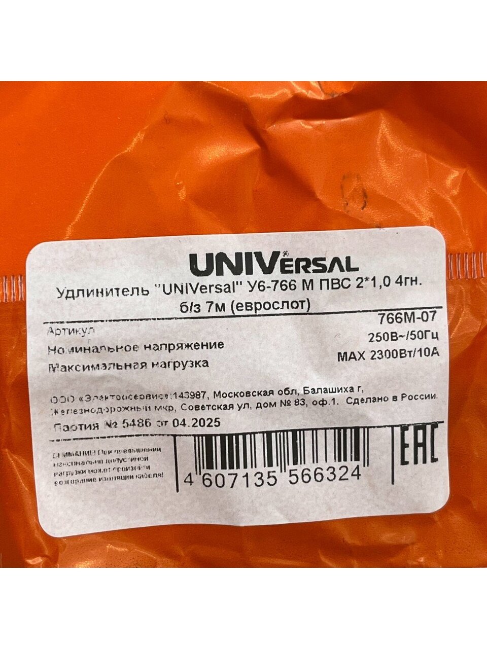 Удлинитель UNIVersal У6-766 рекомендован для использования внутри помещений (квартиры, офисные помещения) как для продолжительного многократного использования, так и для кратковременных подключений к питающей сети.