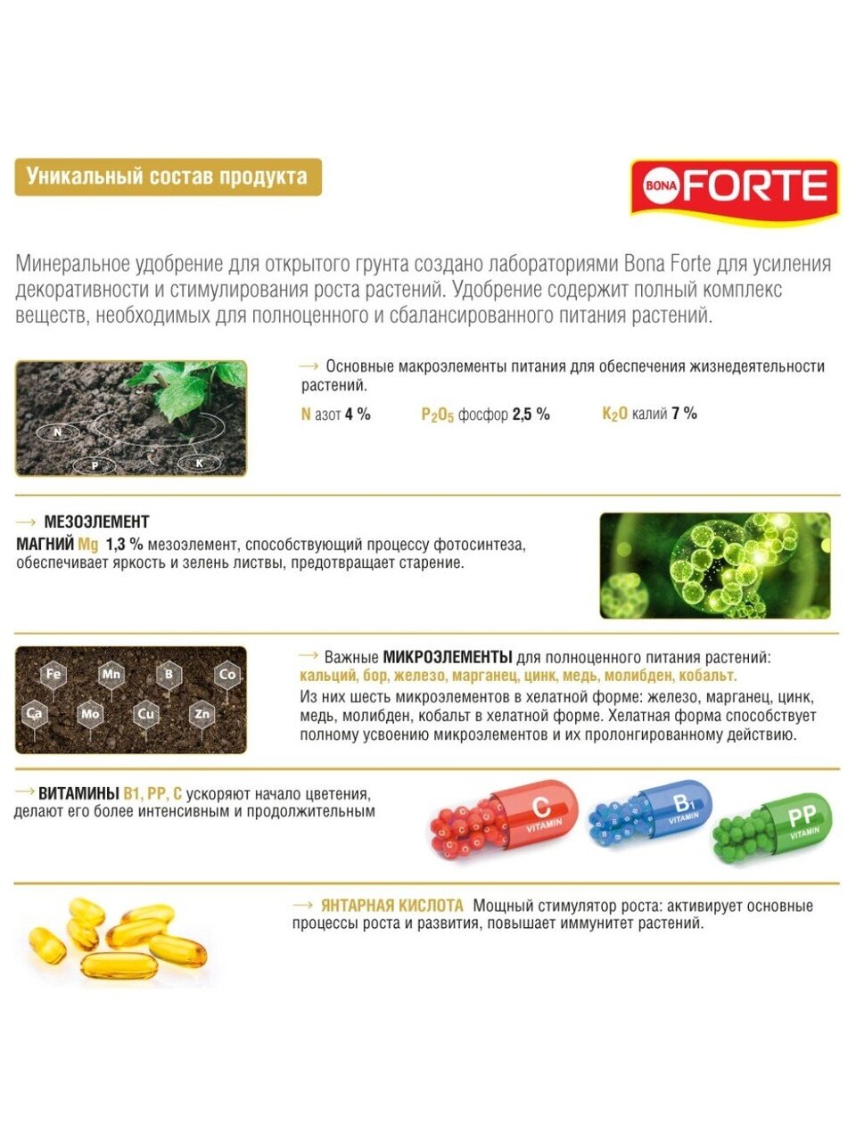 Покупка Bona Forte ЖКУ — это выгодное вложение в красоту и здоровье сада. Продукт помогает экономить время и силы, обеспечивая профессиональный уход за растениями без лишних хлопот. Удобрение подходит как для опытных садоводов, так и для тех, кто только начинает заниматься выращиванием декоративных кустарников и многолетников. Ощутите разницу в качестве цветения и роста с Bona Forte!