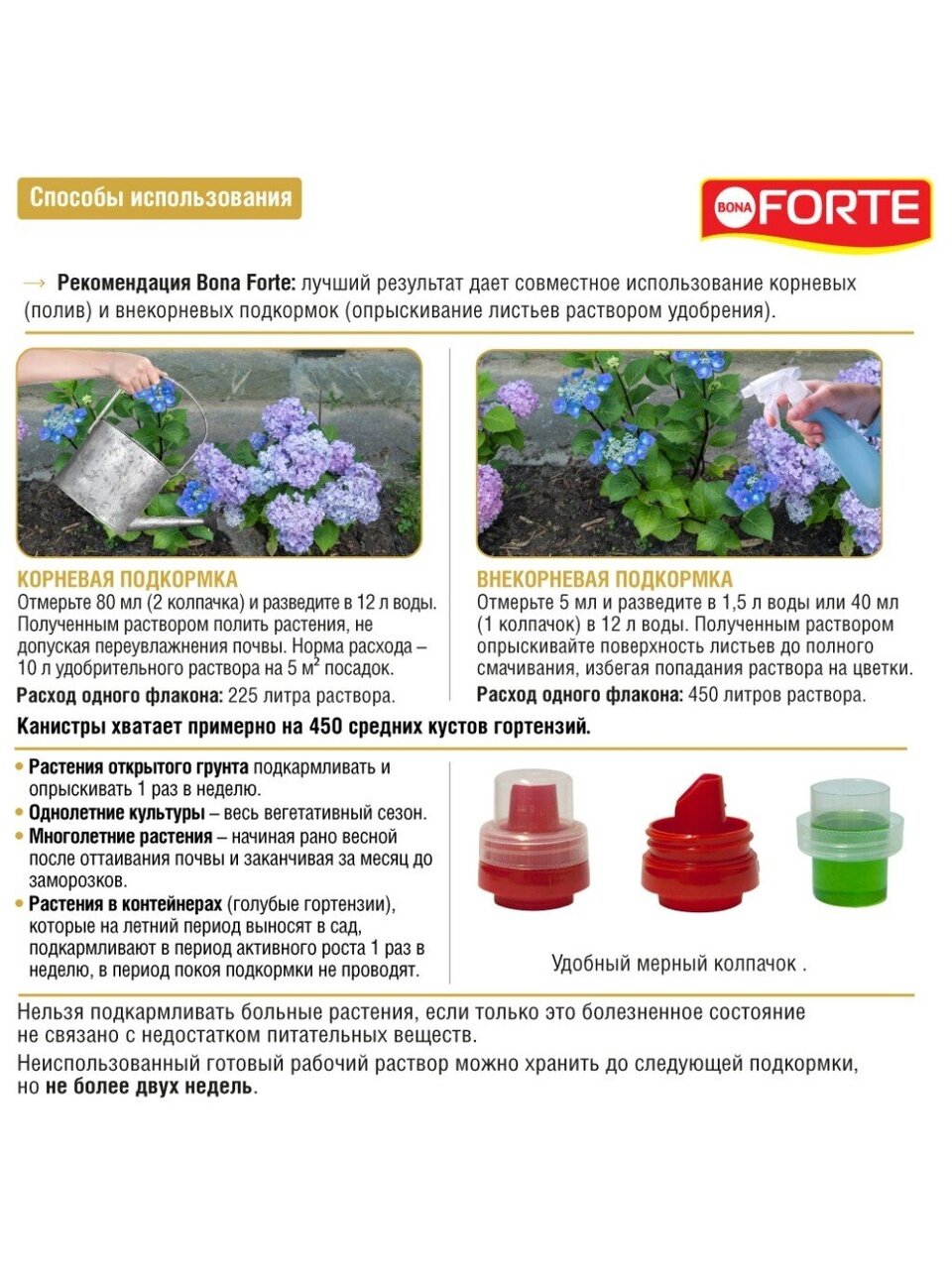 - способствует яркому и продолжительному цветению голубых гортензий;