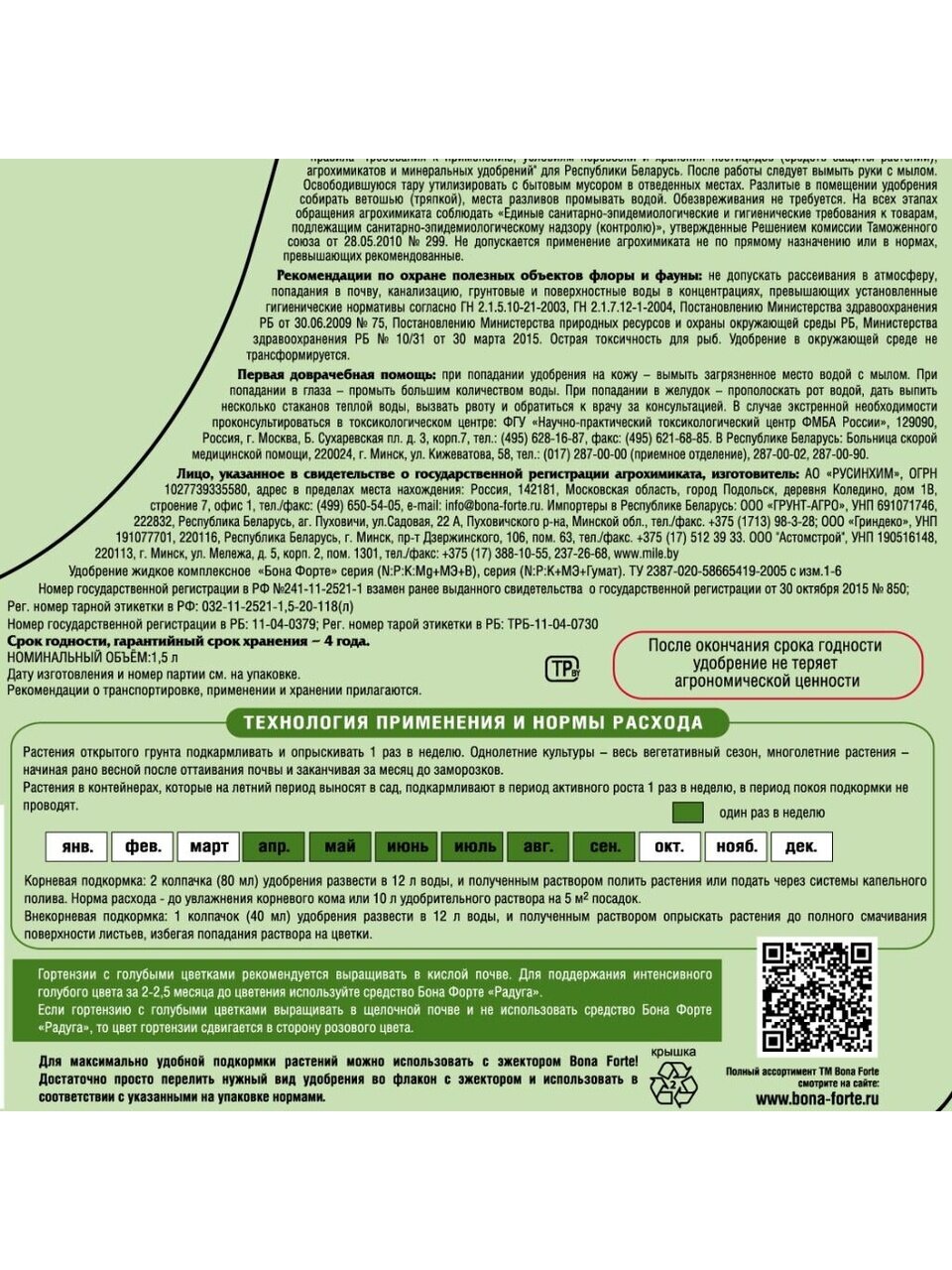 Выбирая Bona Forte ЖКУ для голубых гортензий, вы получаете уверенность в отличном результате: декоративные кустарники и многолетники будут радовать здоровым видом и продолжительным цветением. Продукт создан с учетом особенностей российских климатических условий, что делает его особенно актуальным для садоводов и дачников. Эффективная формула способствует улучшению декоративных качеств растений и облегчает регулярный уход за любимыми культурами.