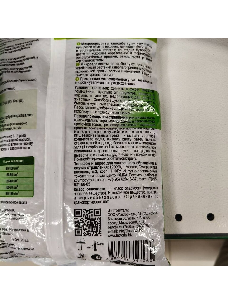 Высокоэффективное «Универсальное минеральное удобрение с микроэлементами» в состав которого входят все необходимые микро- и макроэлементы для оптимального развития растения. Используется как основное удобрение при подготовке почвы к посеву и посадке весной, а также как подкормка в период вегетации овощных, плодово-ягодных, цветочно-декоративных культур всех видов комнатных и декоративных садово-парковых растений в открытом и защищенном грунте. Применение удобрения обеспечивает хороший рост растений, повышает урожайность и улучшает вкусовые качества продукта.