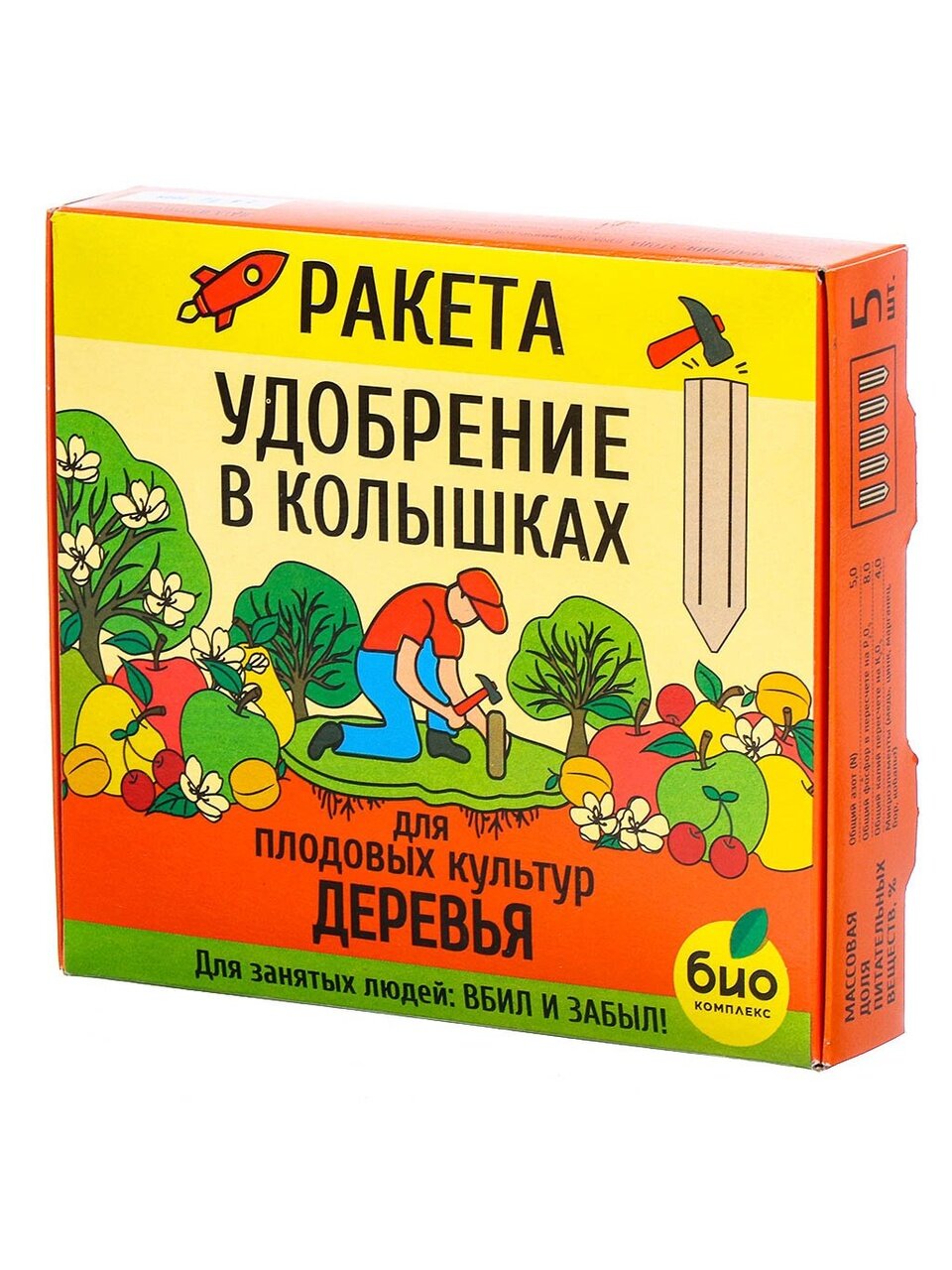 Комплексное минеральное удобрение Ракета Био-комплекс пролонгированного действия предназначено для плодовых деревьев. Выпускается в виде колышков для личных садовых и подсобных хозяйств. Растворение удобрений происходит постепенно в течение всего вегетативного сезона, в отличие от традиционных удобрений, которые сразу растворяются и вымываются из почвы.