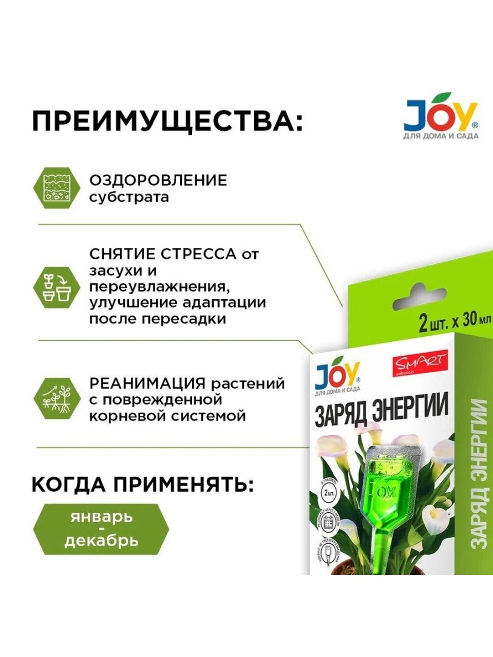 Стимулятор Joy - раствор на основе лактата хитозана и янтарной кислоты является отличным помощником для цветоводов. Он представляет собой готовое средство, разработанное с учетом необходимой пропорции компонентов. Удобрение может быть использовано для реанимации растений с поврежденной корневой системой, что позволяет им восстановиться и продолжить свой рост.