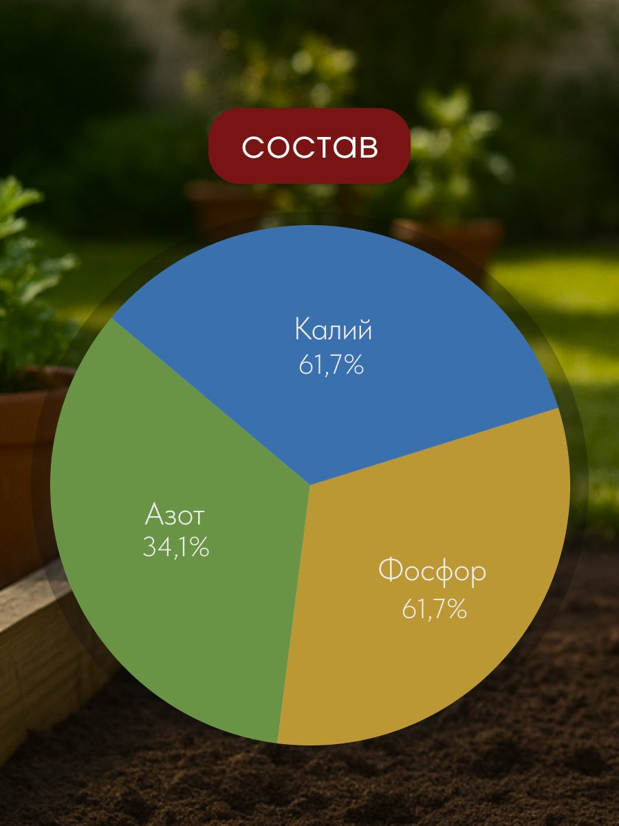 - Состав три основных макроэлемента (NPK): азот (N) 7.5%, фосфор (P2O5) 7%, калий (K2O) 7.5 %.