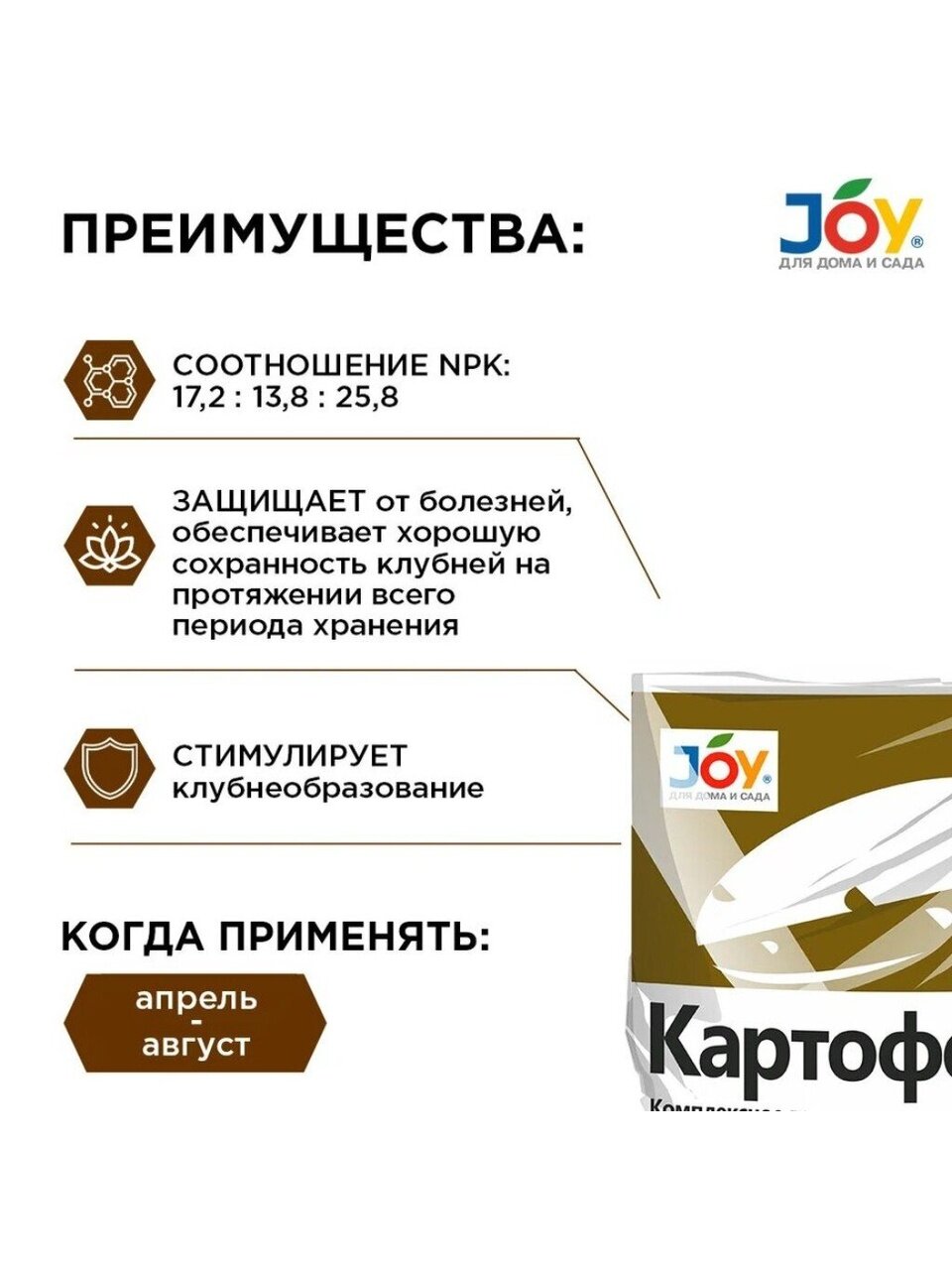 Для этой овощной культуры важными веществами для качественного произрастания являются азотные и калийные удобрения. JOY "Картофель" станет вашим отличным помощником в выращивание картофеля, эта подкормка применяется на любых видах почв.