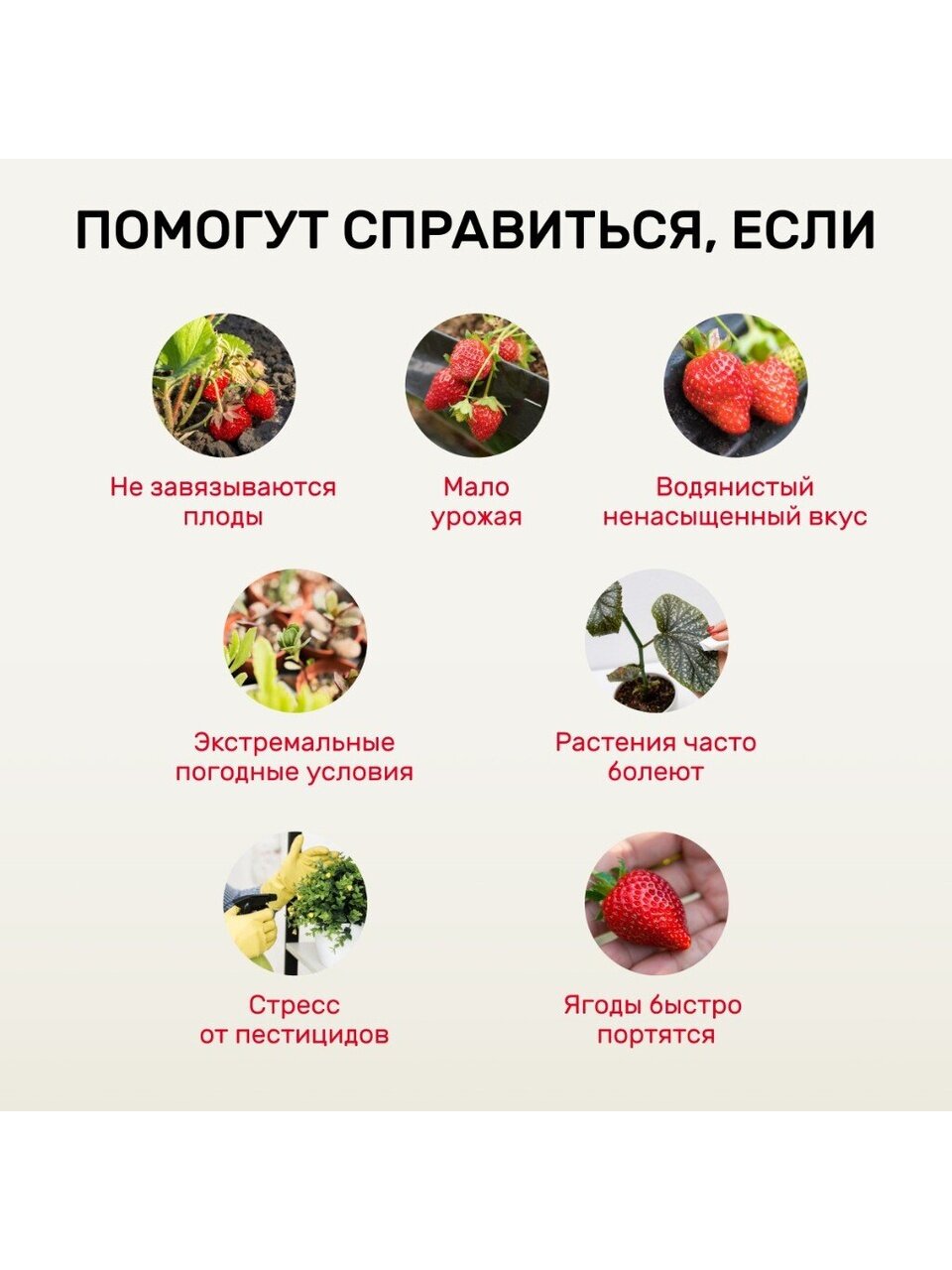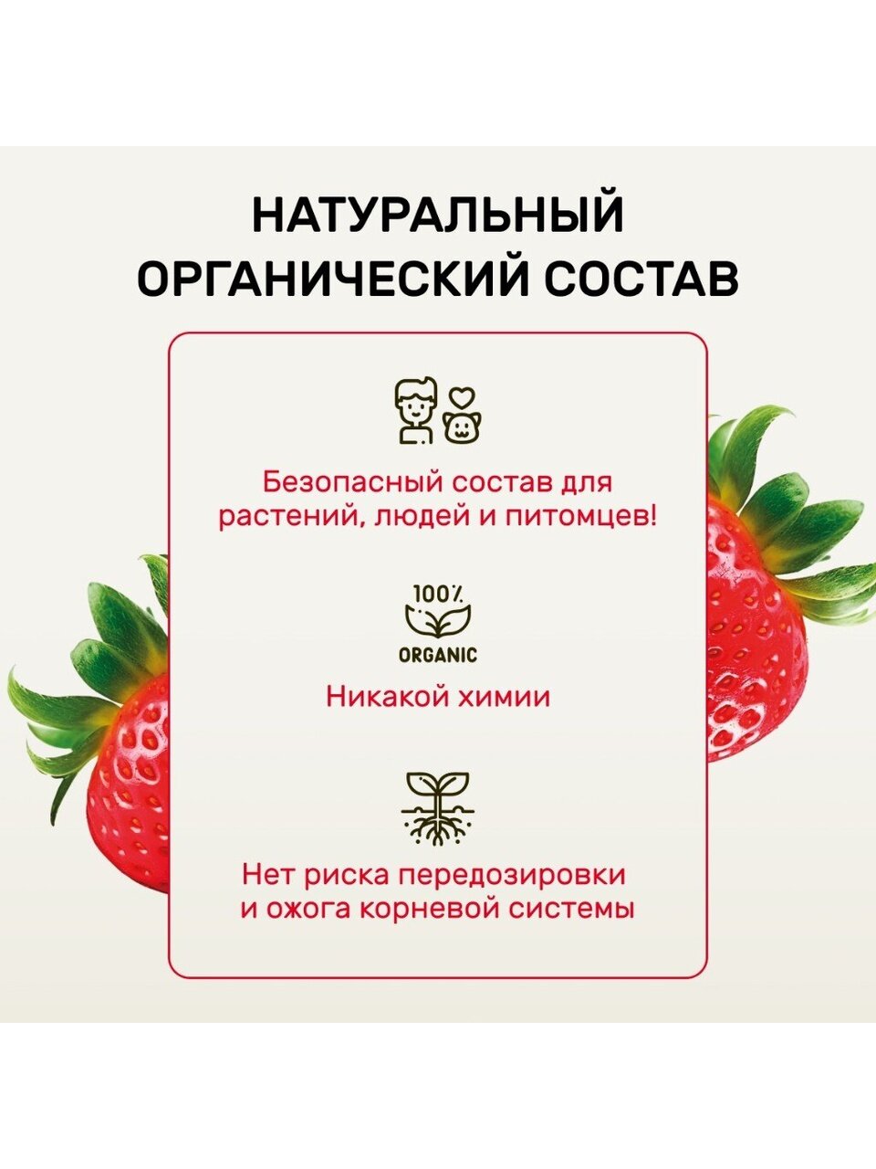- Уникальная формула «Биомолекулы» — органический стимулятор, ускоряющий рост и повышающий урожай клубники.