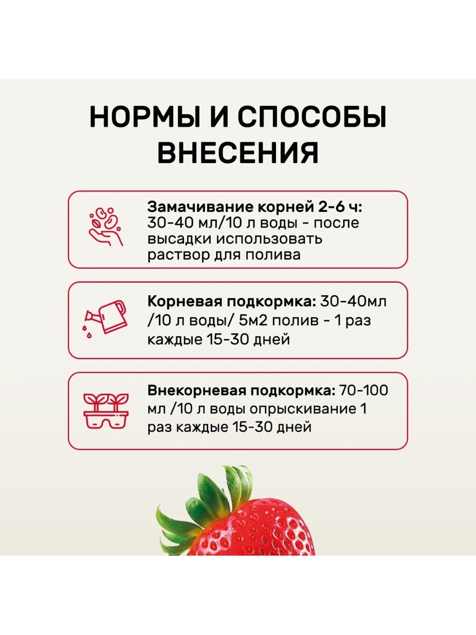 Разведите жидкость согласно инструкции на упаковке (обычно 10 мл на 1 л воды) и поливайте клубнику в фазе роста или цветения. Объем 400 мл рассчитан на 40-50 применений.